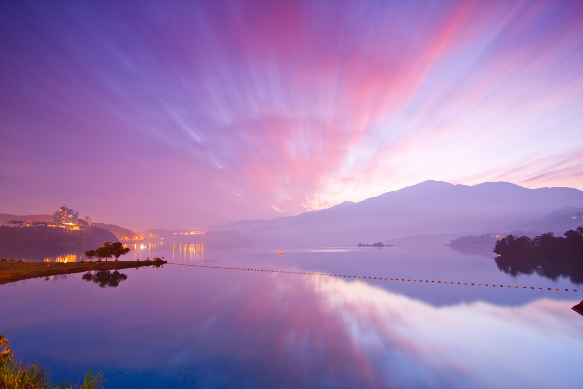 Liegeplatz am See vor dem Hintergrund der rosa Wolken