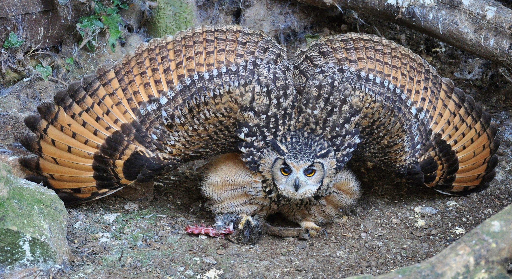 Eine eule in freier wildbahn mit ausgestreckten flügelnEine Eule in freier Wildbahn mit ausgestreckten Flügeln