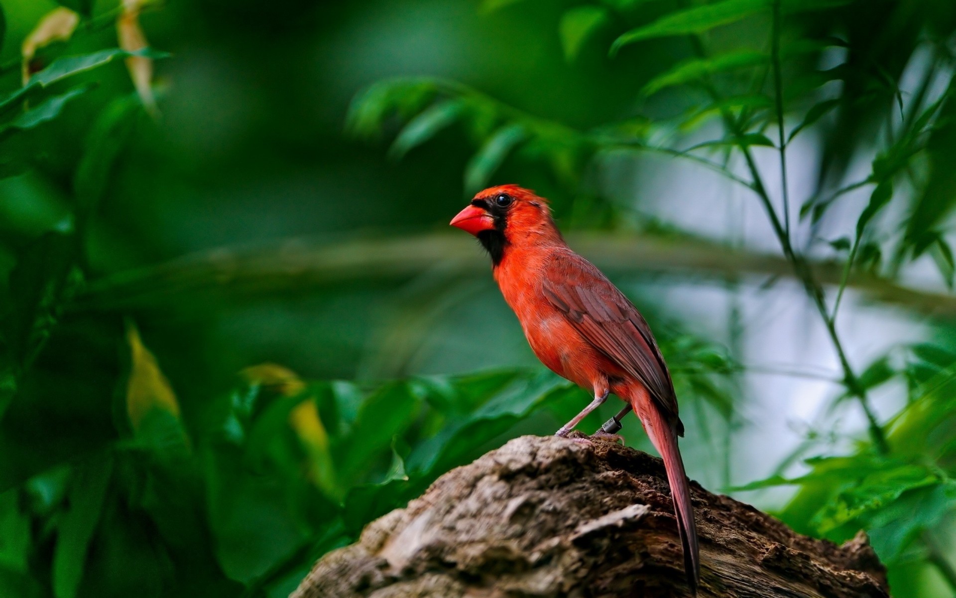 Unter dem Laub sitzt ein roter Vogel auf einem Ast