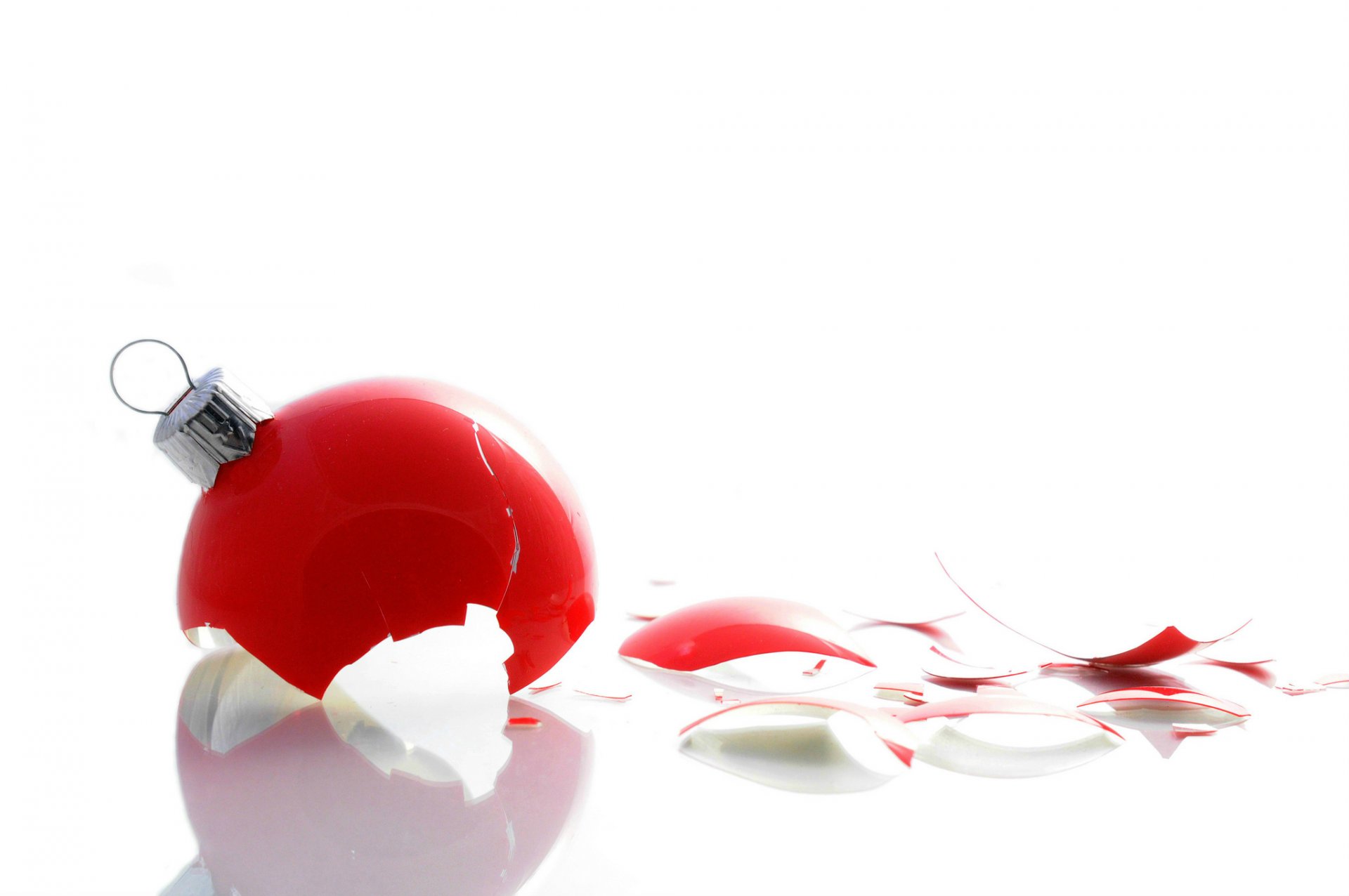 Zerbrochenes rotes weihnachtsbaum-spielzeug auf weißem hintergrundZerbrochenes rotes Weihnachtsbaum-Spielzeug auf weißem Hintergrund