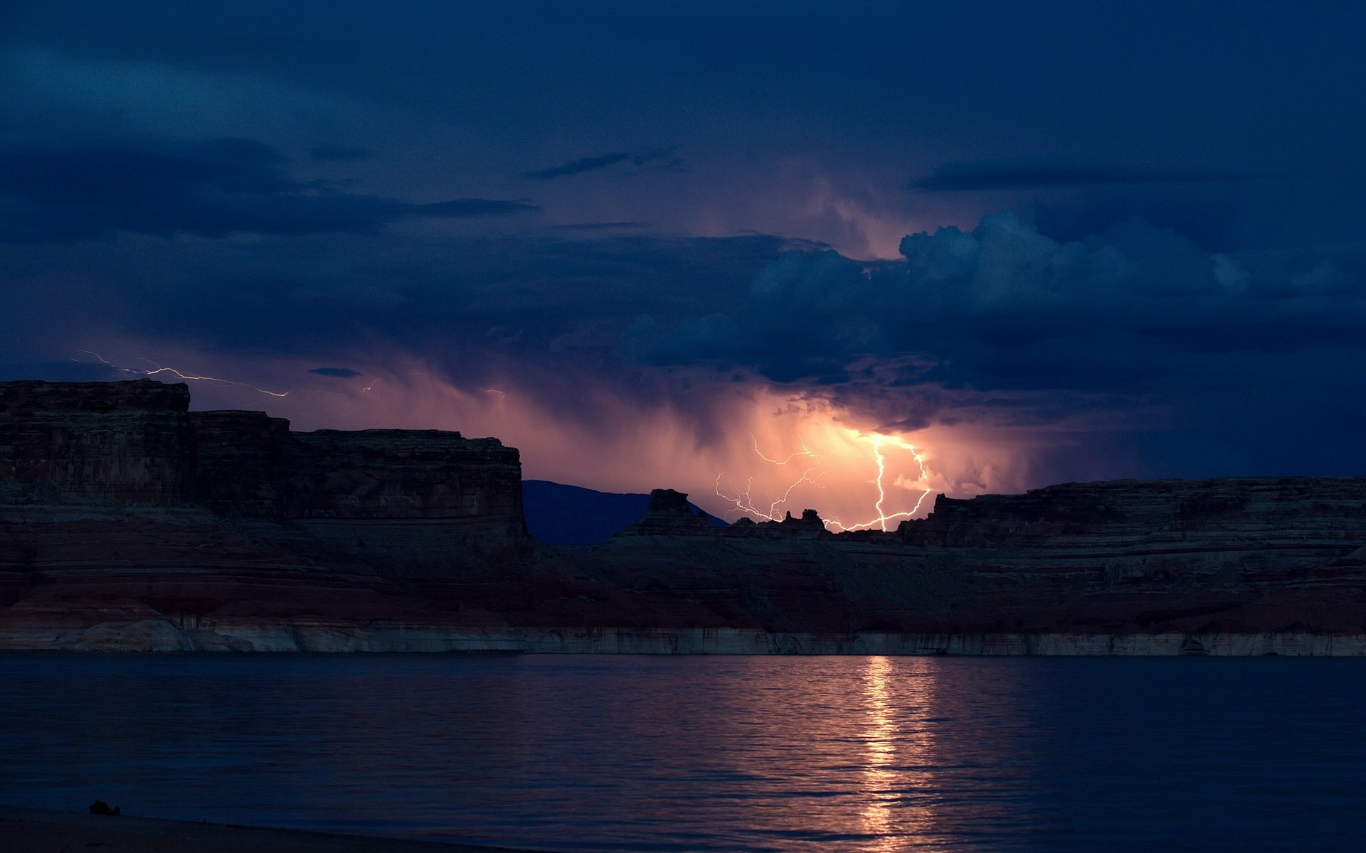 Nächtlicher Sturm mit Gewitter und Blitz über dem Meer