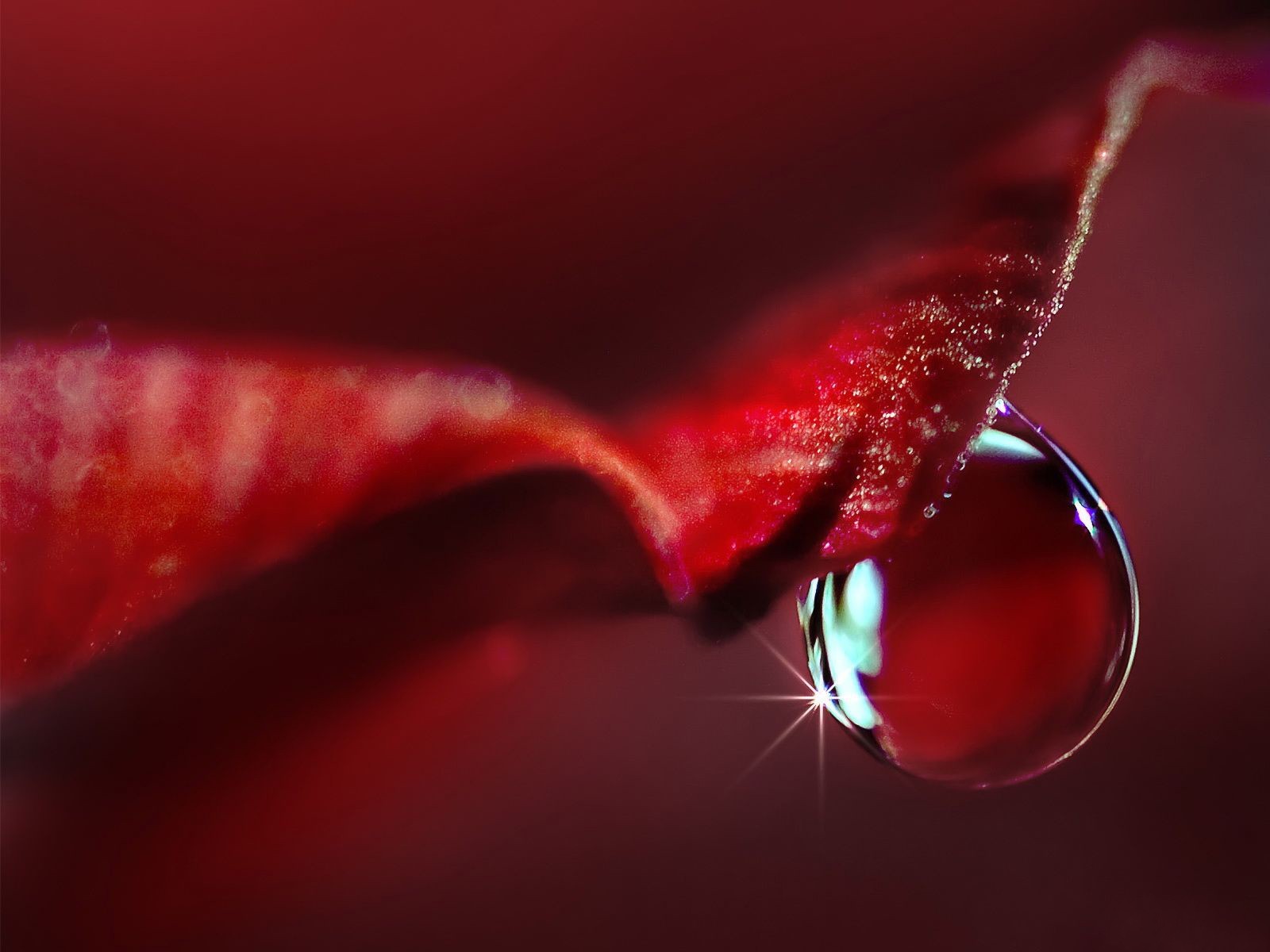 Ein Tropfen Wasser auf einem roten Blütenblatt