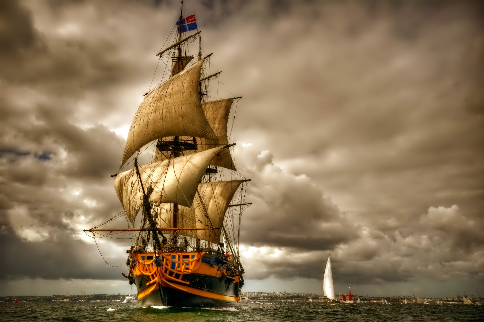 Vor dem Hintergrund der Gewitterwolken schwimmt das Schiff