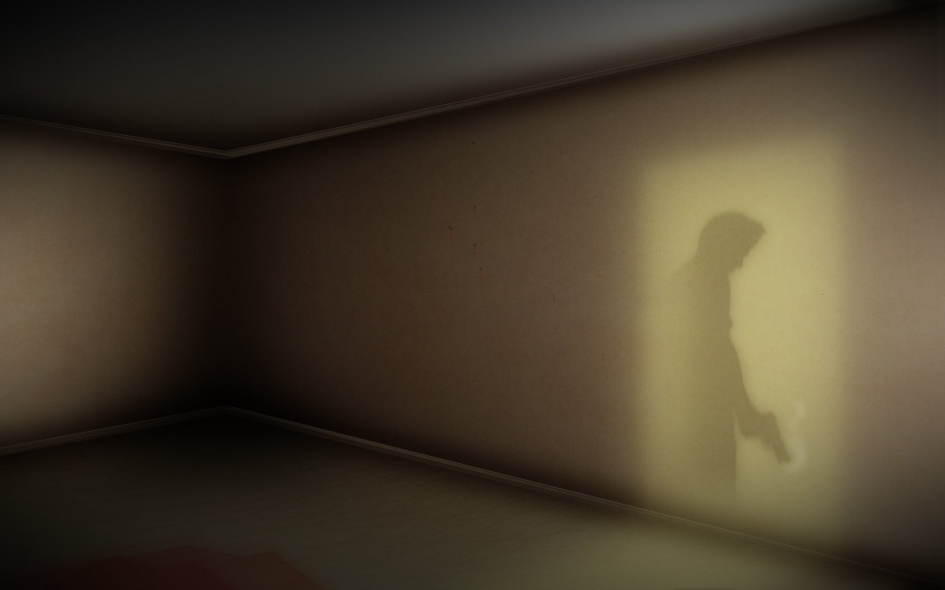 Schatten eines Mannes mit einer Pistole auf grünem Holzhintergrund