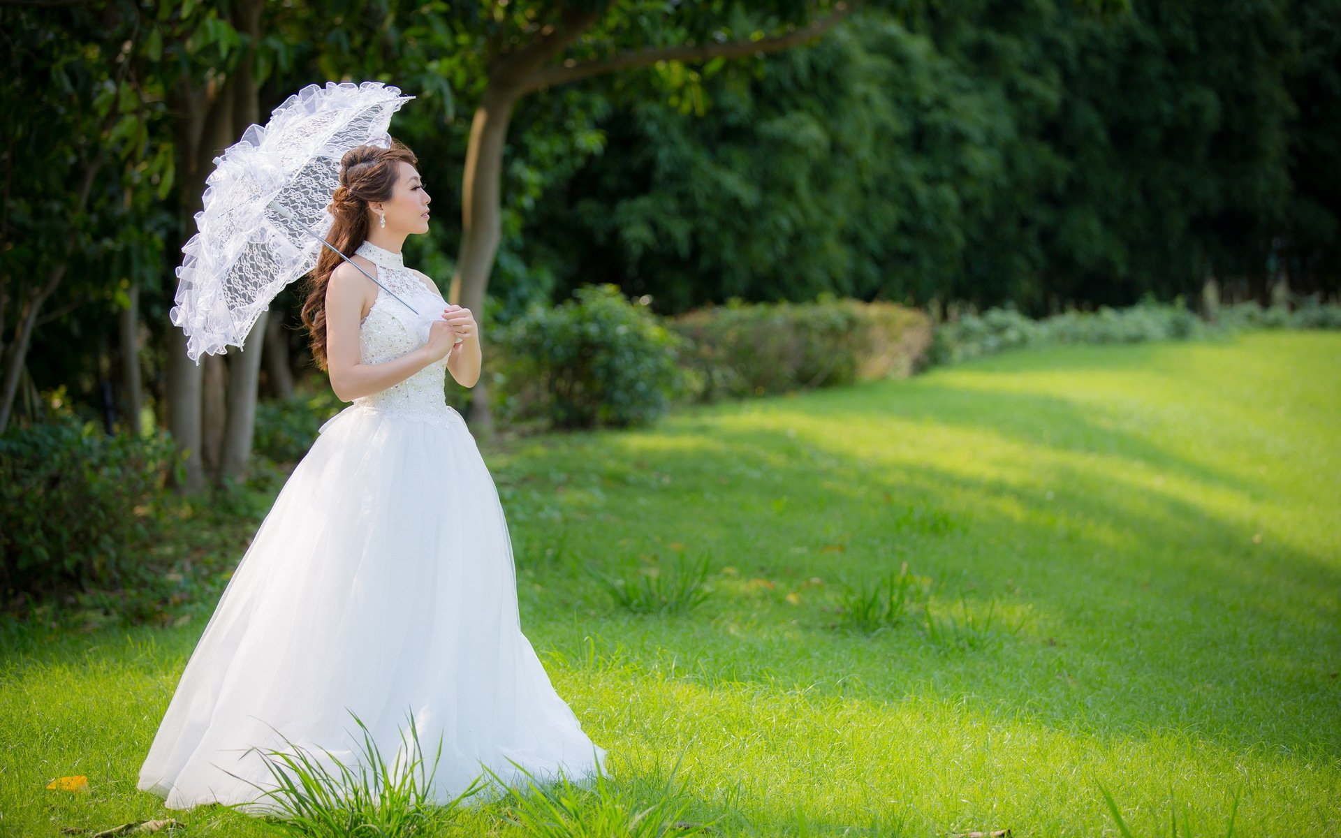 Asiatisches mädchen im hochzeitskleid unter dem sommerschirmAsiatisches Mädchen im Hochzeitskleid unter dem Sommerschirm