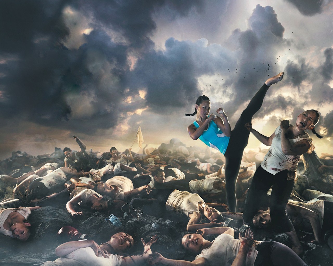Mächtiger Schlag eines schönen Mädchens im Kampf gegen einen Soldaten