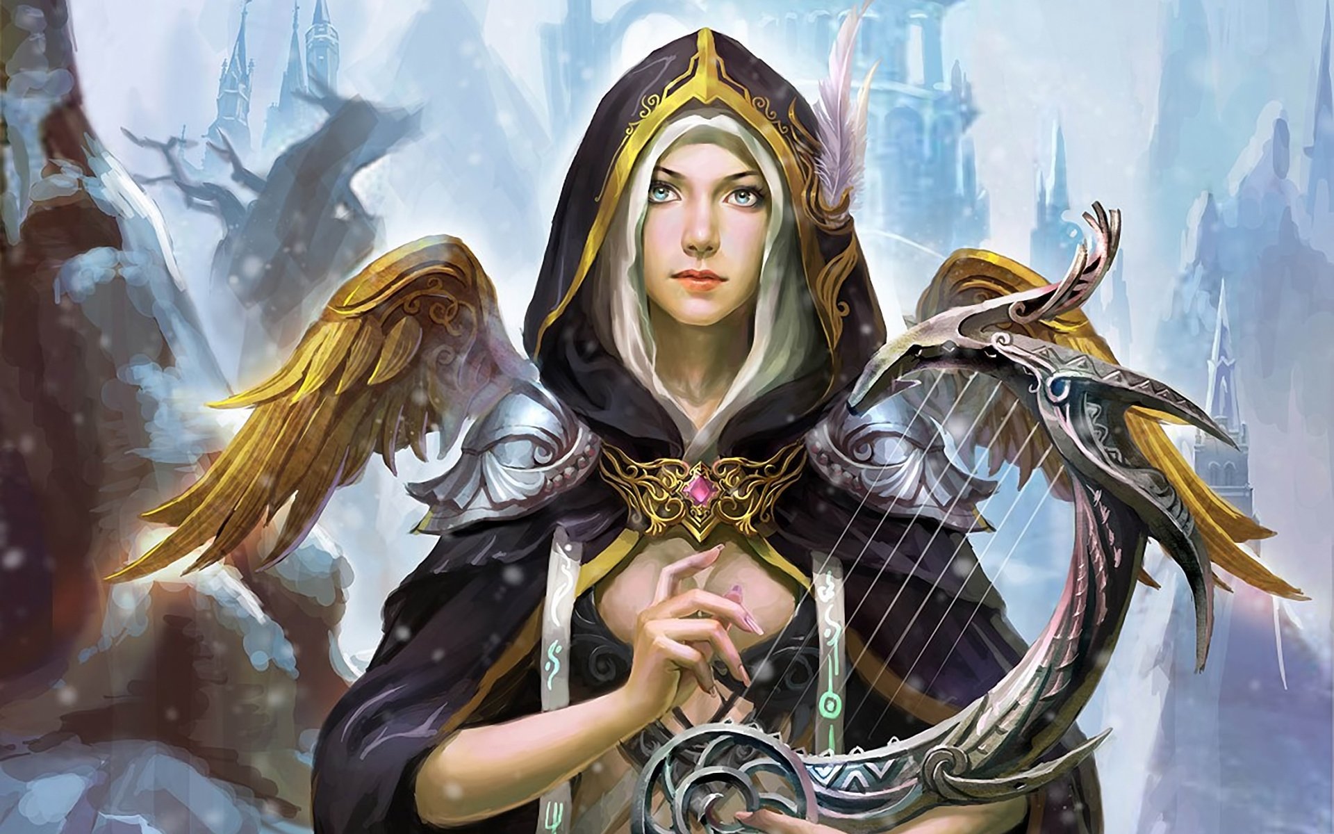 Mädchen mit flügeln in einem dunklen schneebedeckten schloss