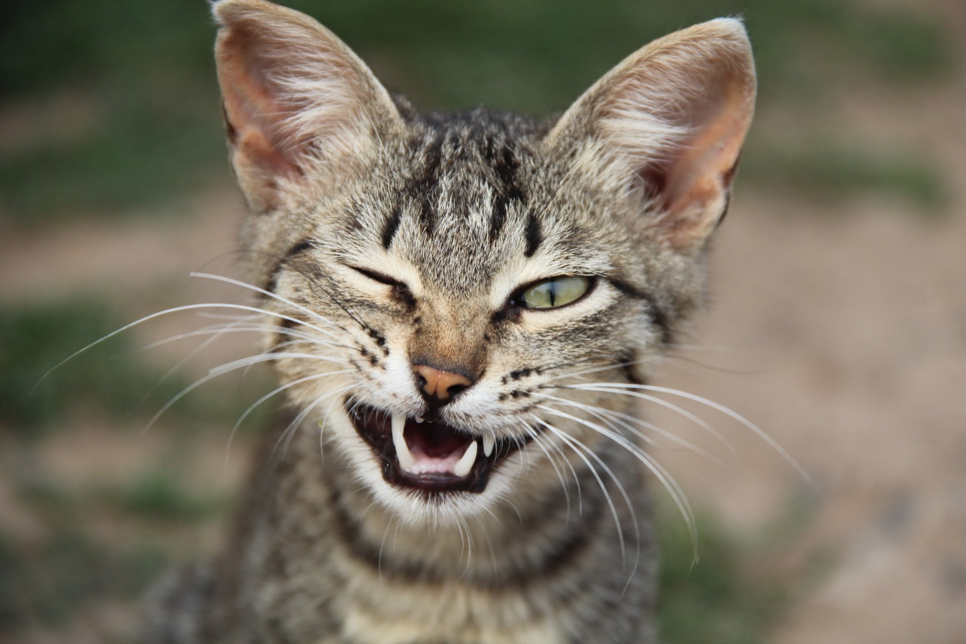 Eine Ohrenkatze hat ihre Eckzähne ausgestellt