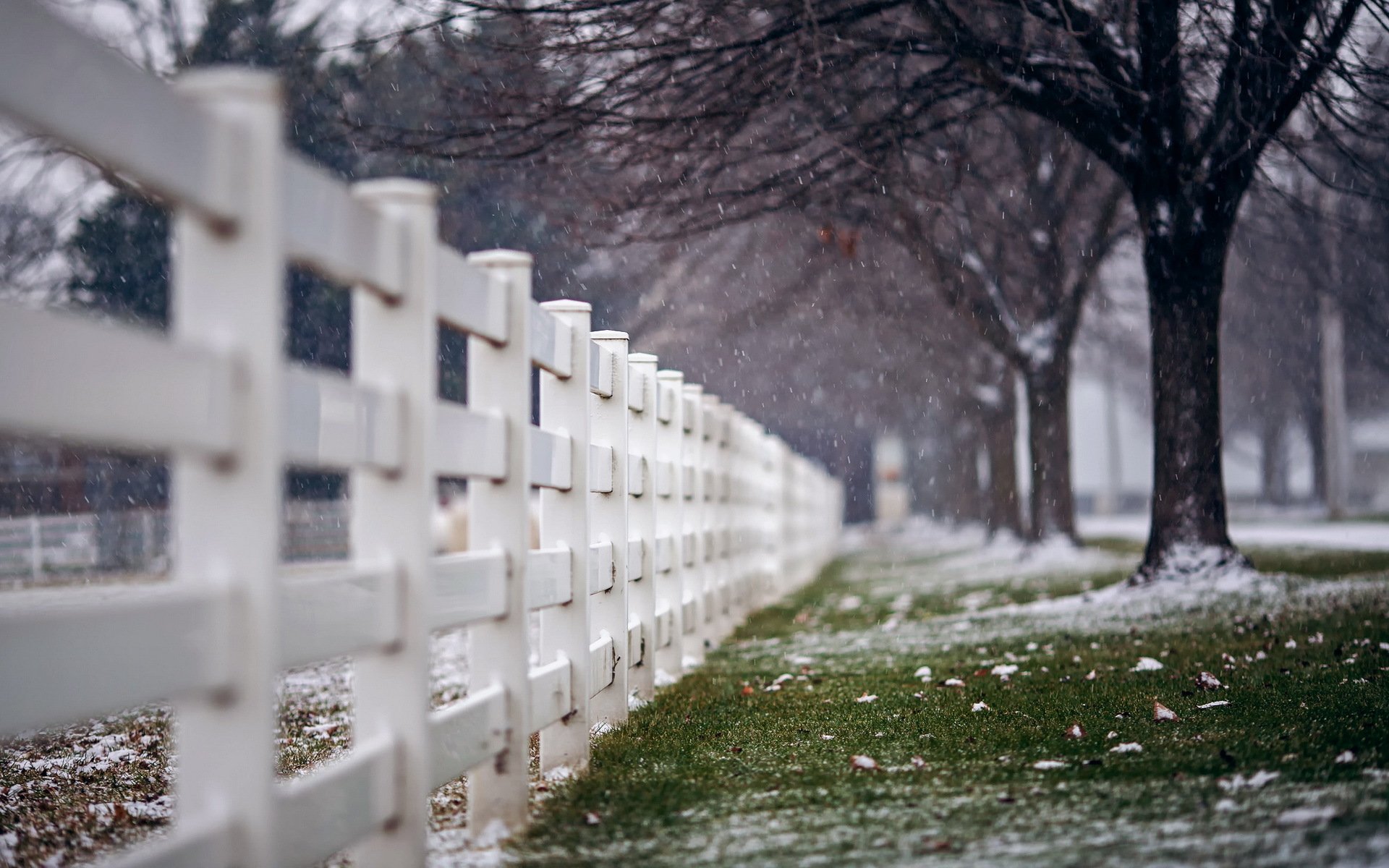 Stadtstraße mit weißem Zaun und erstem Schnee