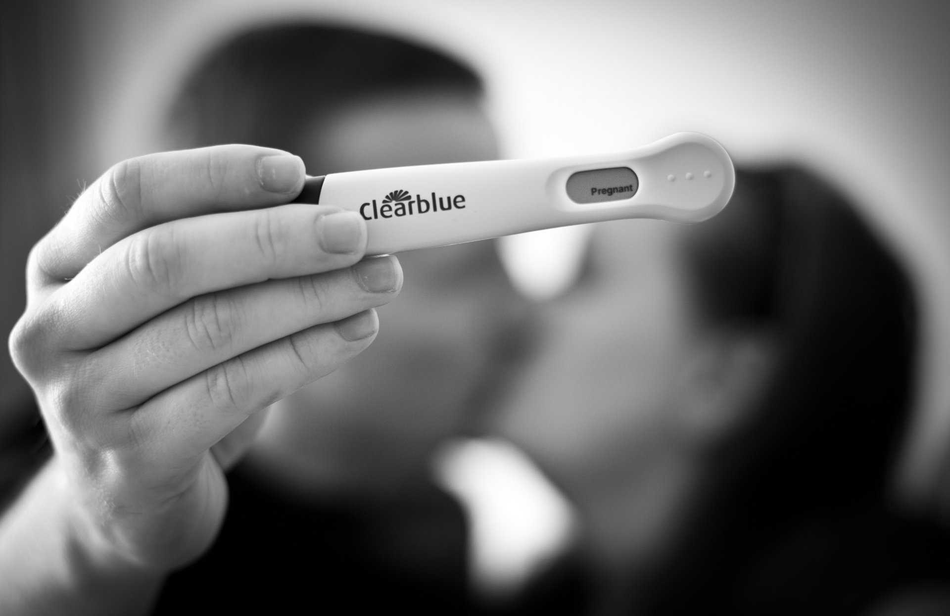 Glückliche menschen küssen sich auf einem schwarz-weiß-foto und halten einen schwangerschaftstest in der handGlückliche Menschen küssen sich auf einem Schwarz-Weiß-Foto und halten einen Schwangerschaftstest in der Hand
