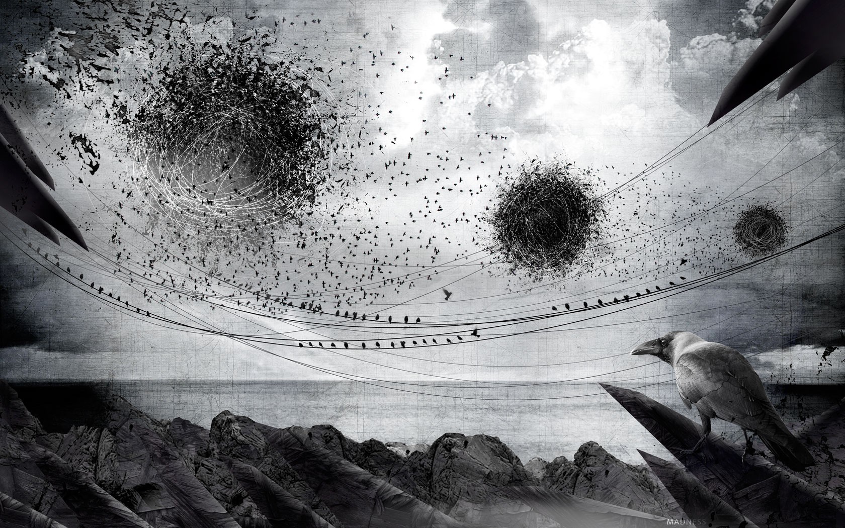 Ein Schwarm düsterer Vögel am Himmel über der Einöde
