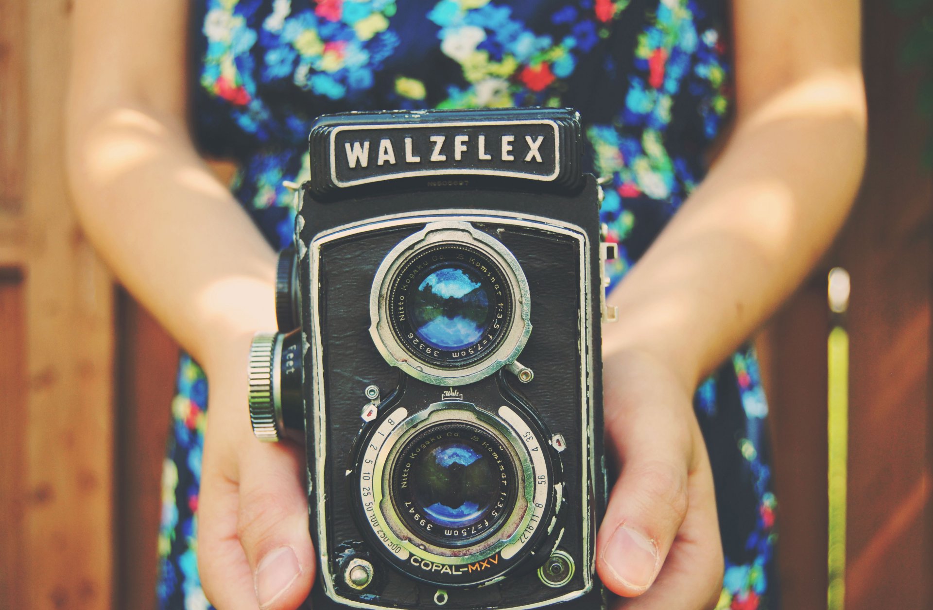 Es gibt eine kamera und eine kleine schwarze aufhängung in form einer kamera in der näheEs gibt eine Kamera und eine kleine schwarze Aufhängung in Form einer Kamera in der Nähe