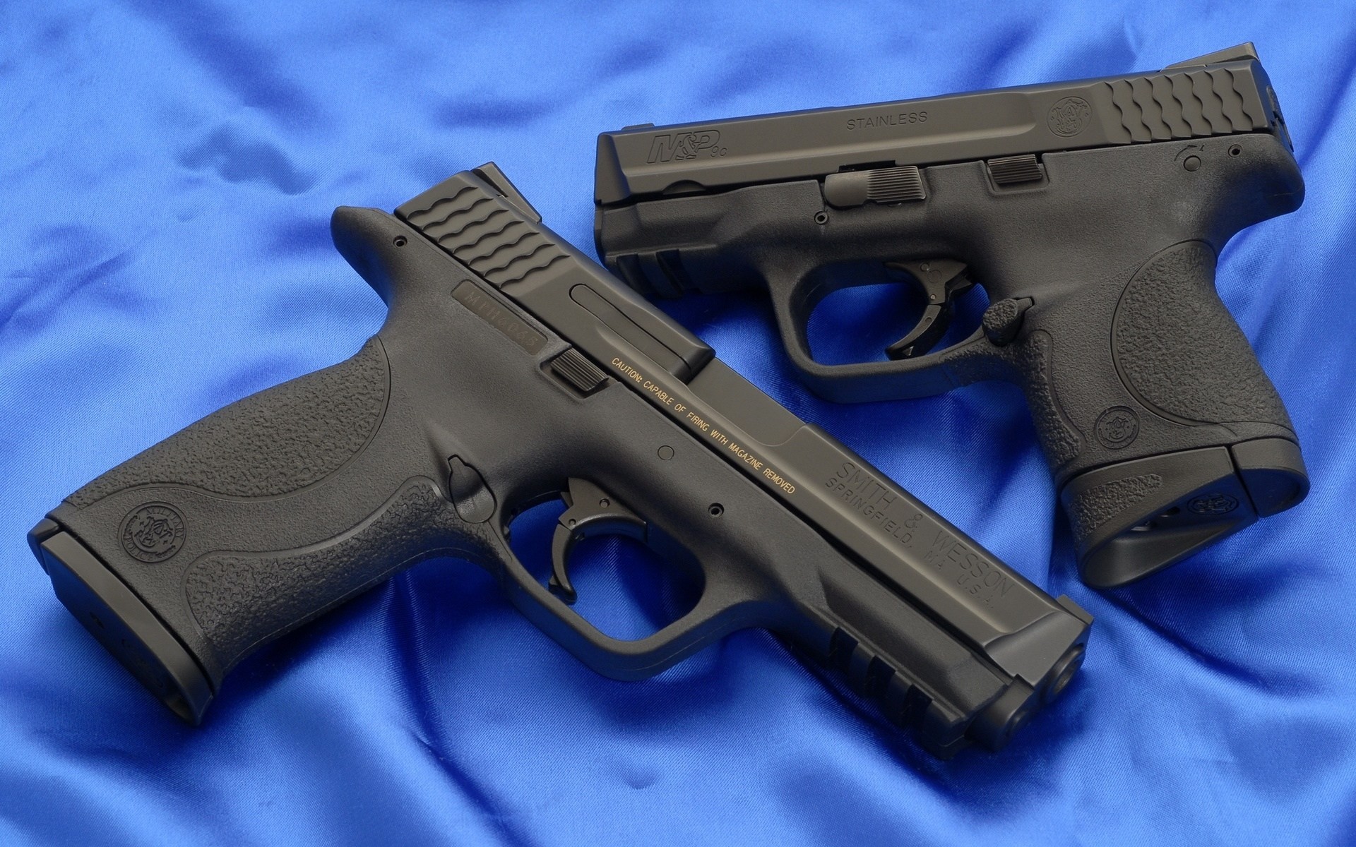 Zwei schwarze polizeipistolen auf blauem stoffhintergrundZwei schwarze Polizeipistolen auf blauem Stoffhintergrund