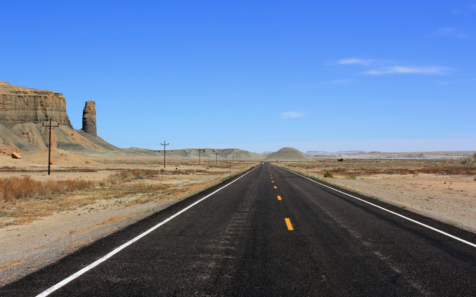 Schwarze Autobahn in der Wüste mit Felsen
