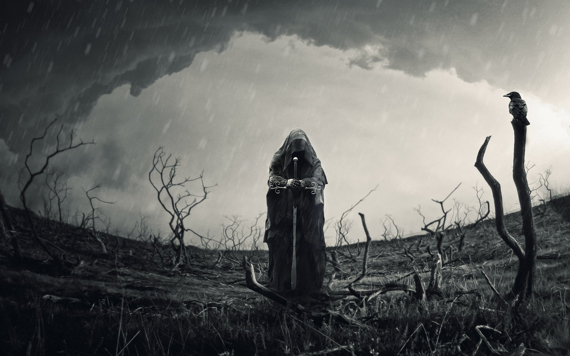 Ein mann ist ein krieger mit einem schwert in den händenEin Mann ist ein Krieger mit einem Schwert in den Händen