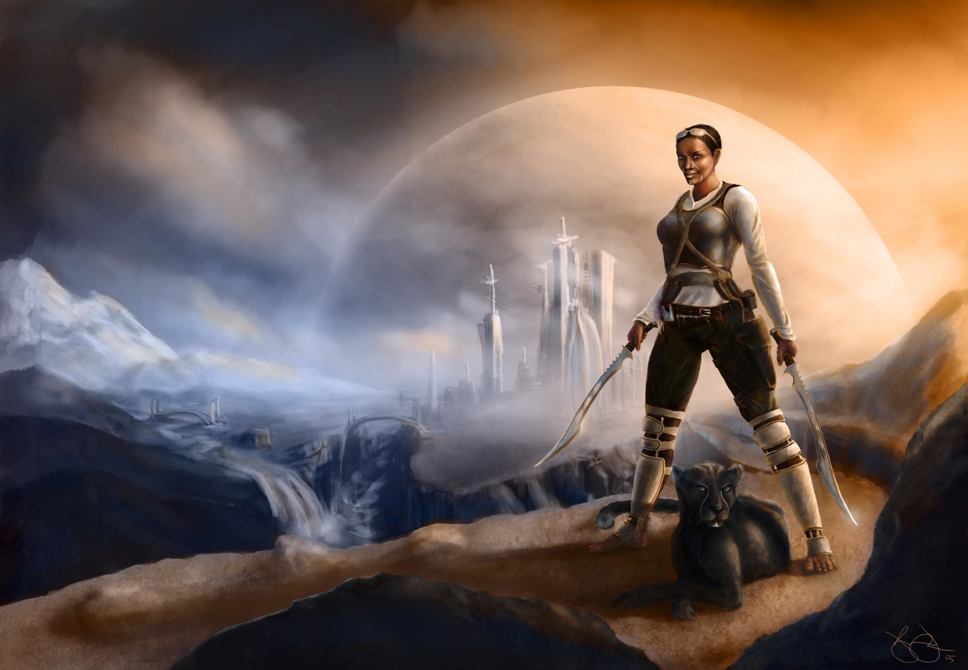 Ein kriegerisches Mädchen mit einem Schwert und einem Panther
