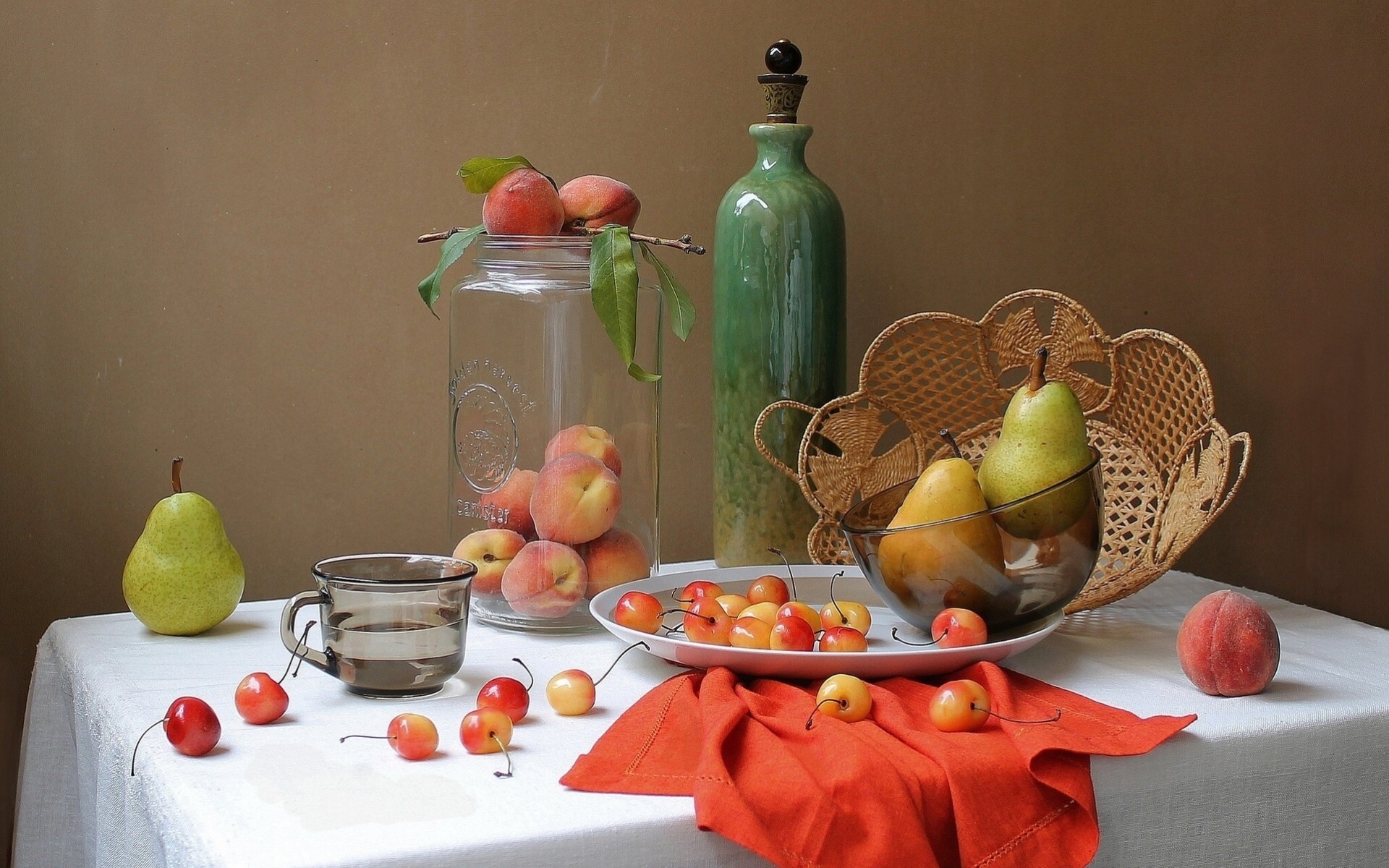 Stillleben helle Beeren und Servietten, Pfirsiche in einem transparenten Krug, Birnen in einer Tasse