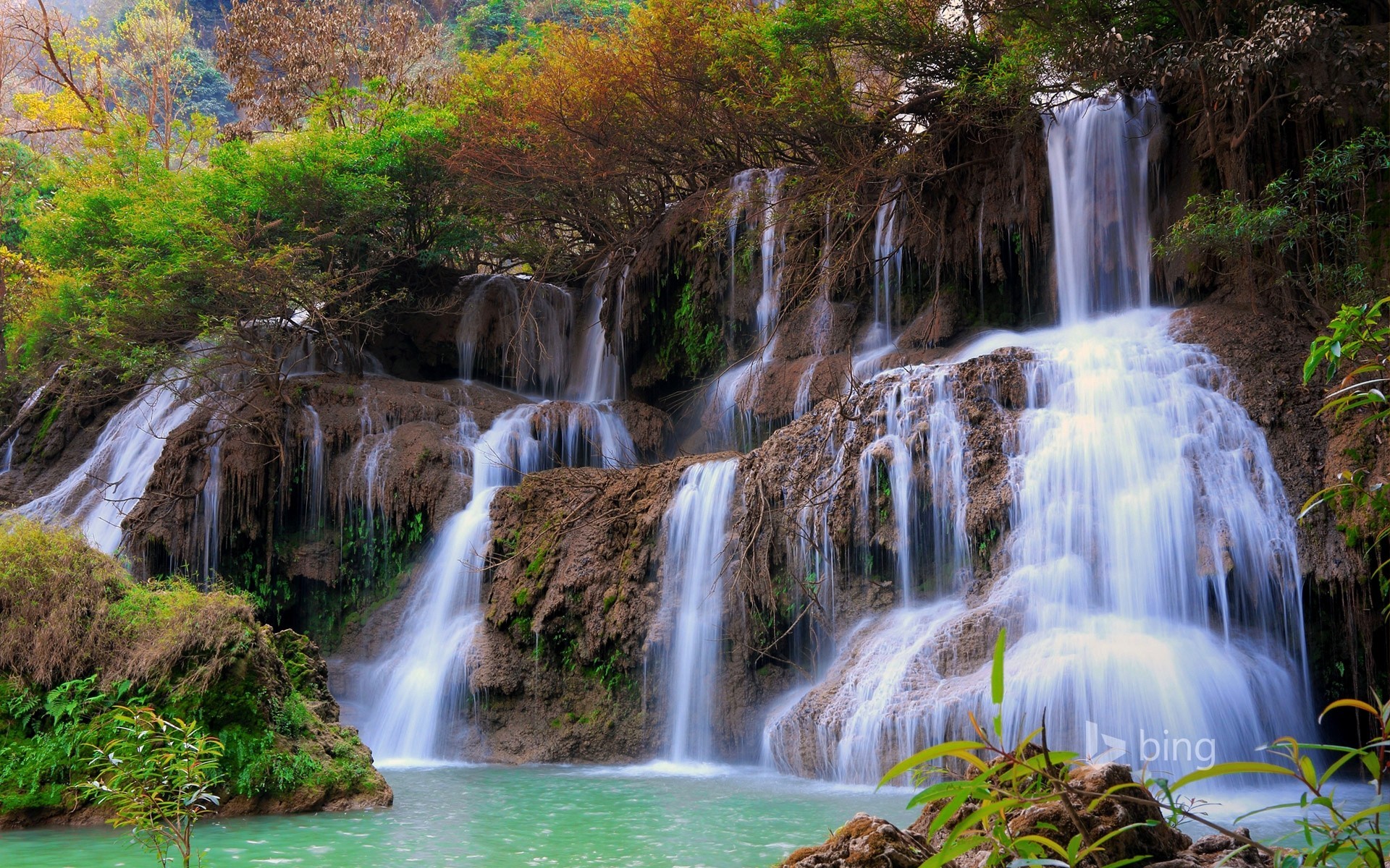 Ein Tiger umgeben von Palmen, Wasserfällen und Steinen