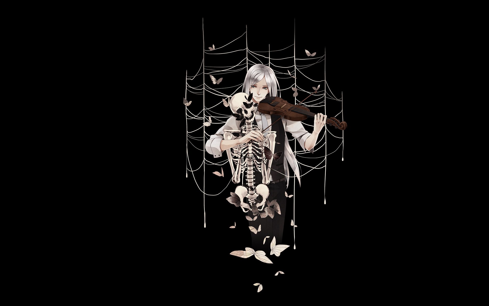 Anime Skelett mit schwarzen Flügeln umarmt ein Mädchen