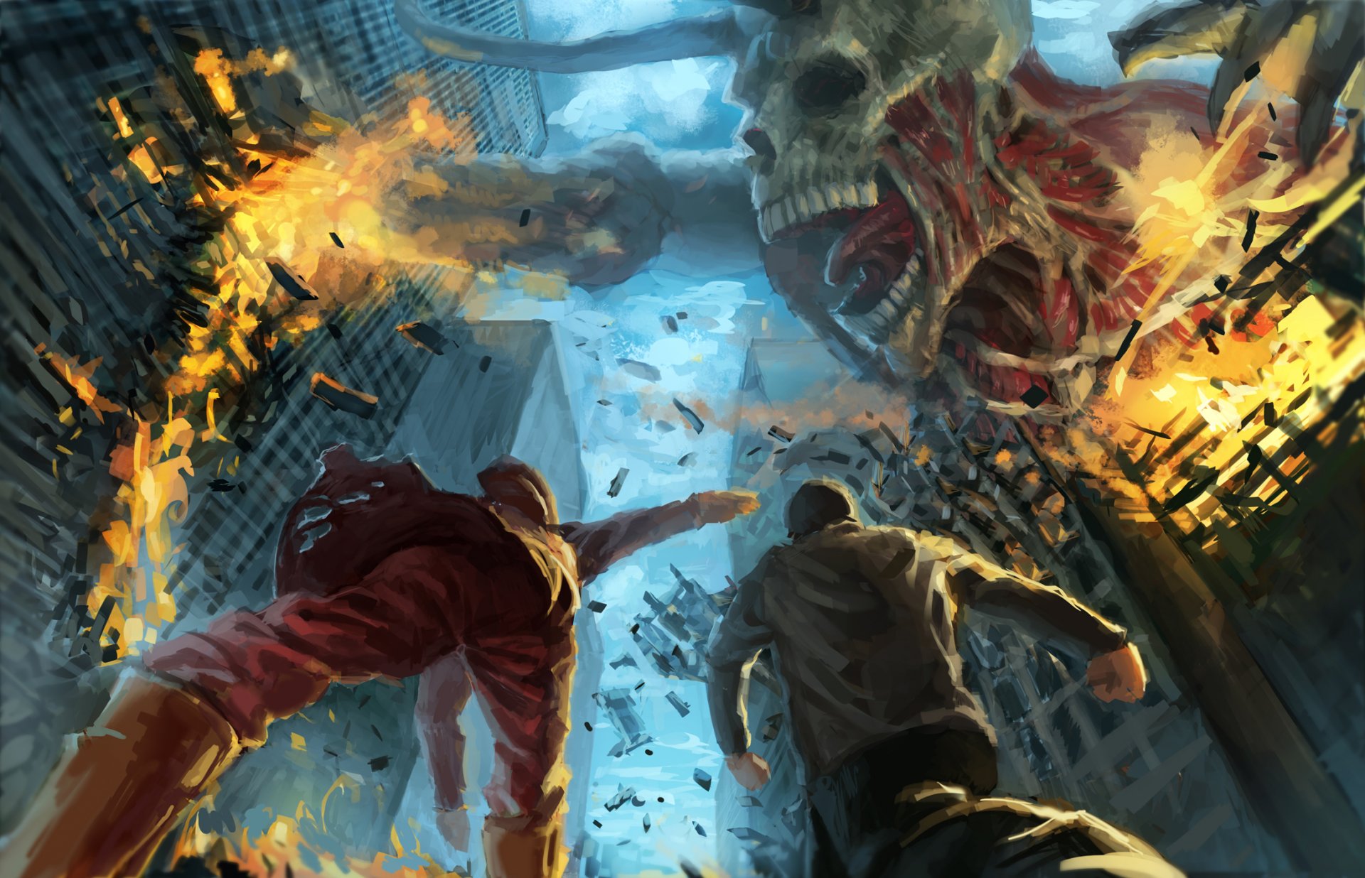 Ein riesiges Skelett mit Hörnern zerstört Gebäude