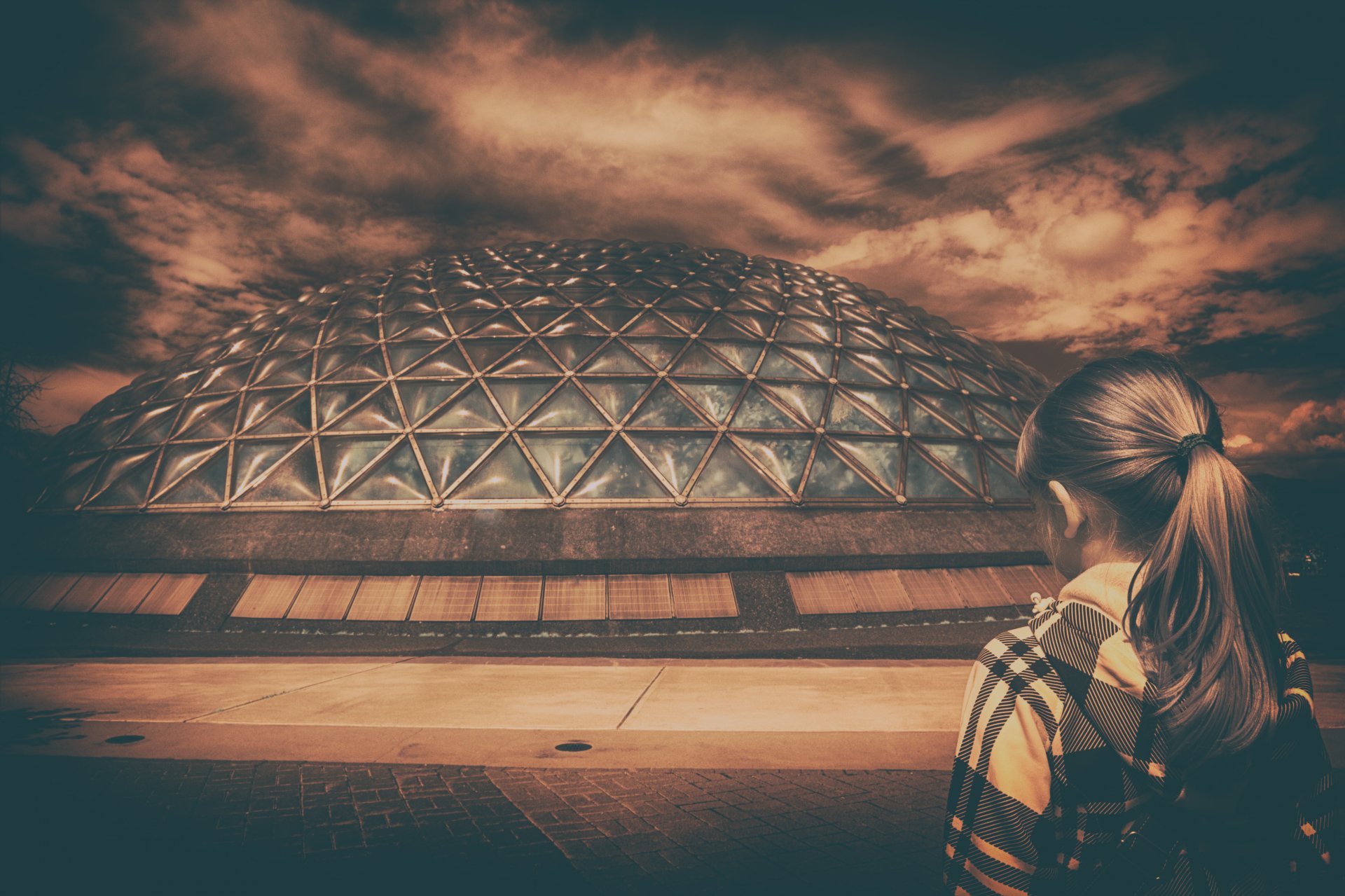 Mädchen auf dem Hintergrund eines düsteren, regnerischen Himmels