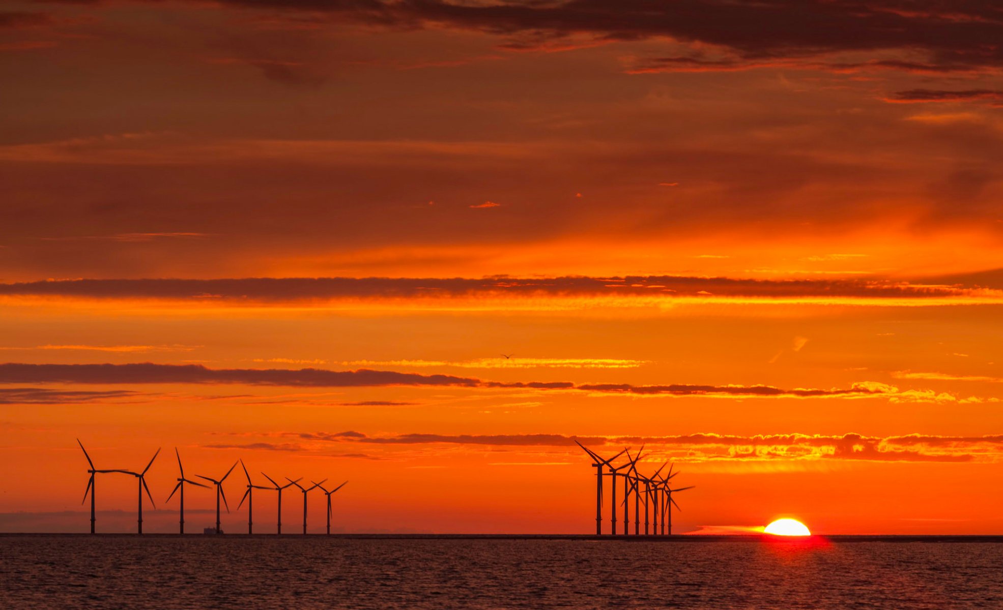 Windmühlen im orangefarbenen Sonnenuntergang