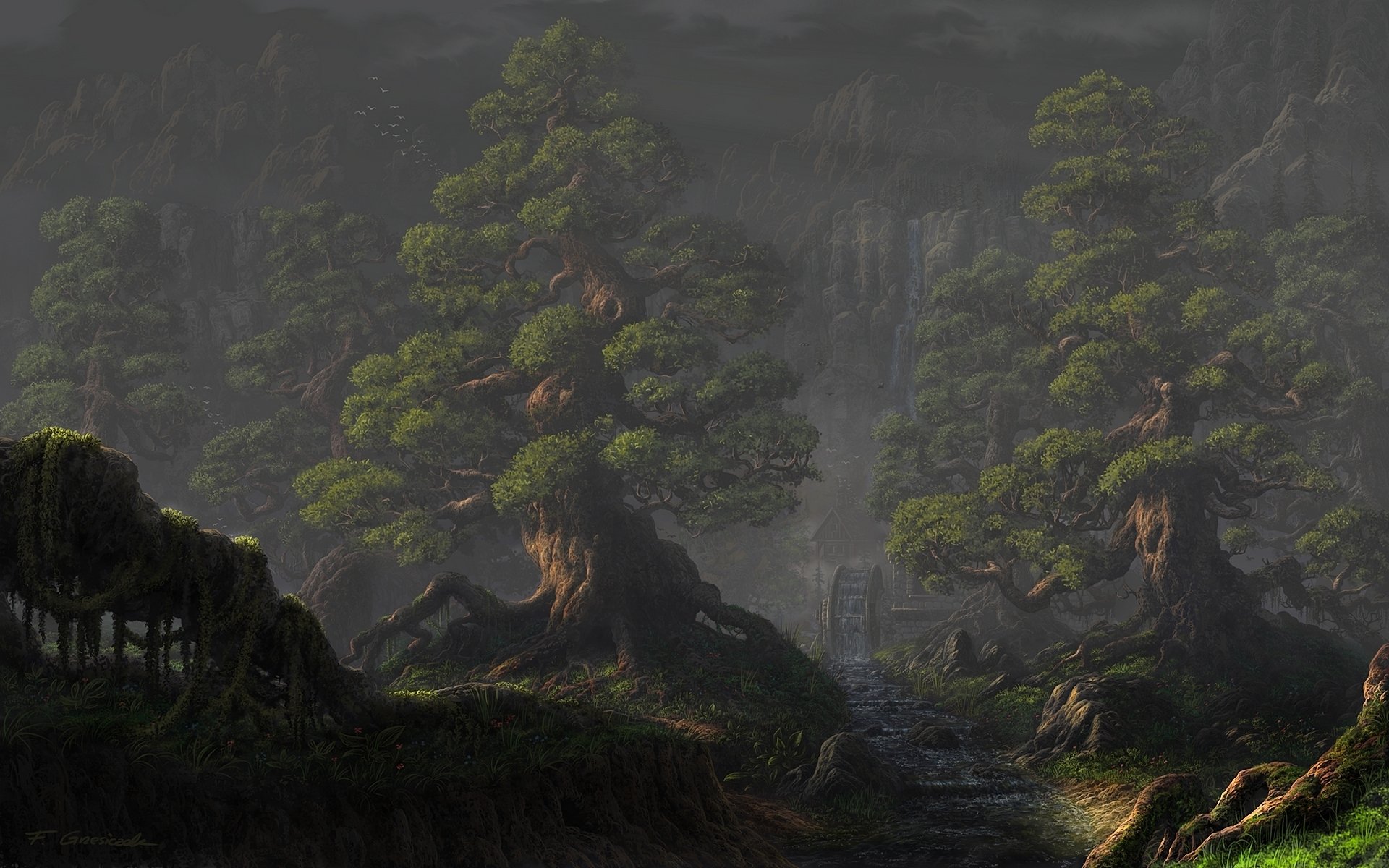 Kunstlandschaft bäume am bach auf dem hintergrund der bergeKunstlandschaft Bäume am Bach auf dem Hintergrund der Berge