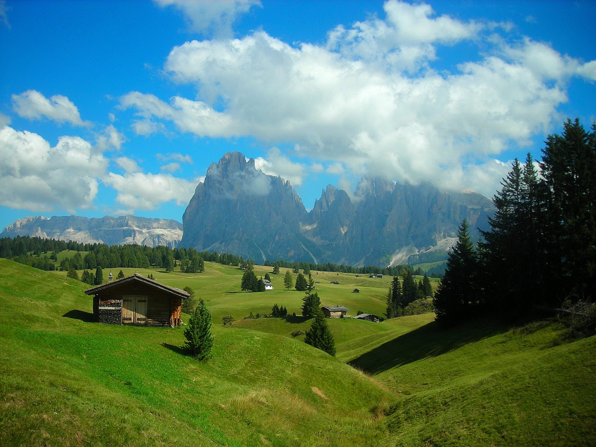 Wald mit Fluss auf dem Hintergrund der Berge mit bewölktem blauem Himmel