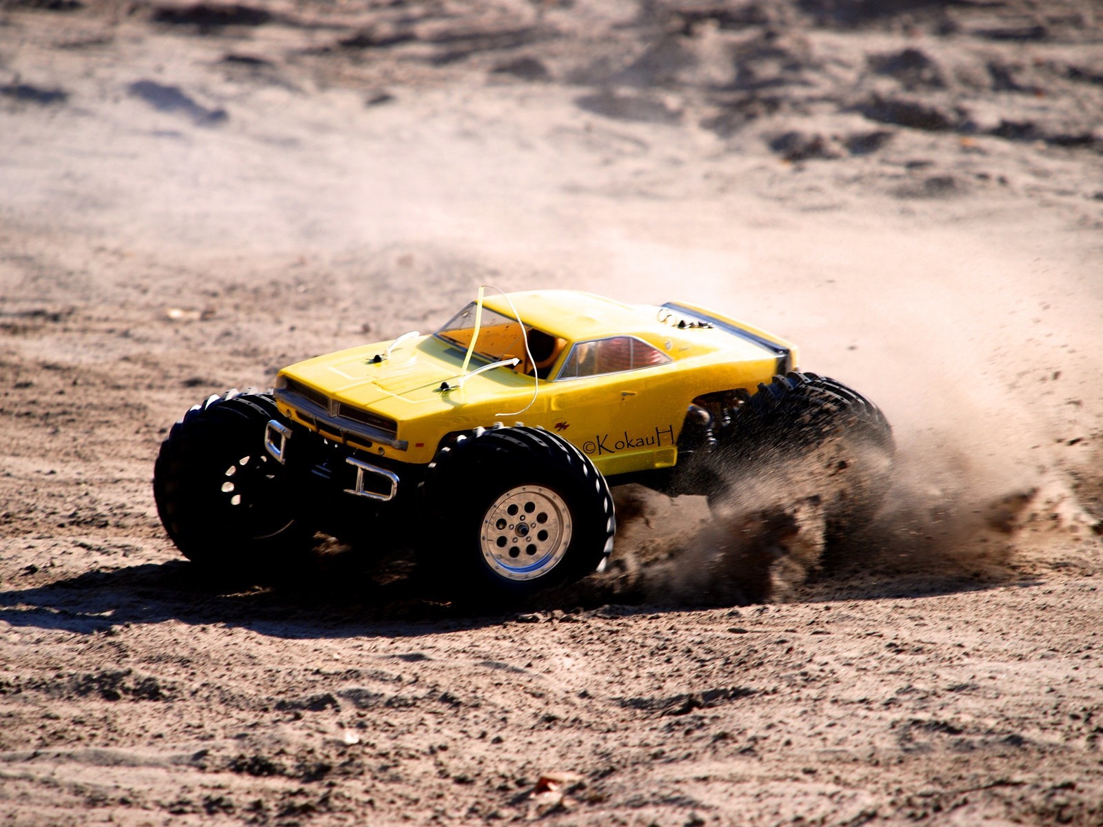 Spielzeuggelbes Auto beim Abbiegen
