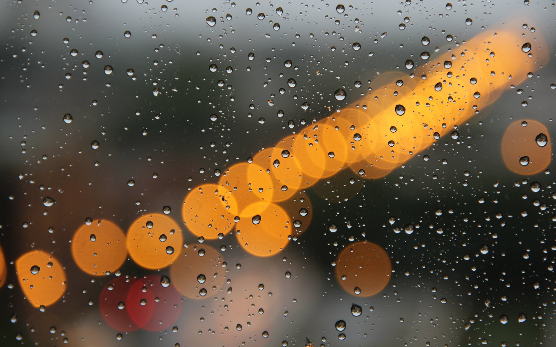 Regentropfen auf Glas vor dem Hintergrund der leuchtenden Stadt