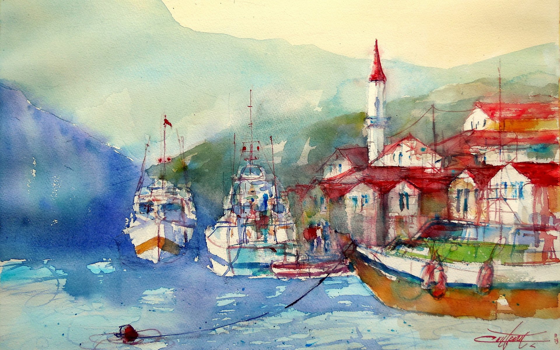 Das haus steht am ufer des flusses und der brücke mit laternenDas Haus steht am Ufer des Flusses und der Brücke mit Laternen