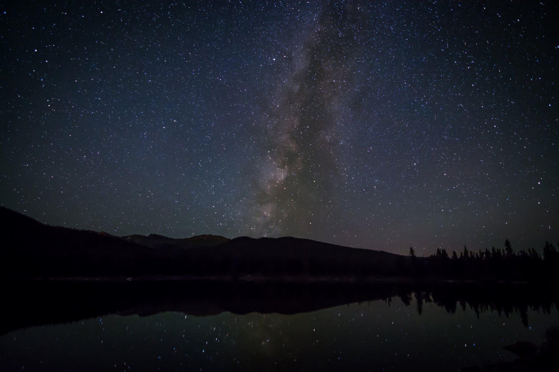 Die Milchstraße und die Sterne und unten der See und der Wald