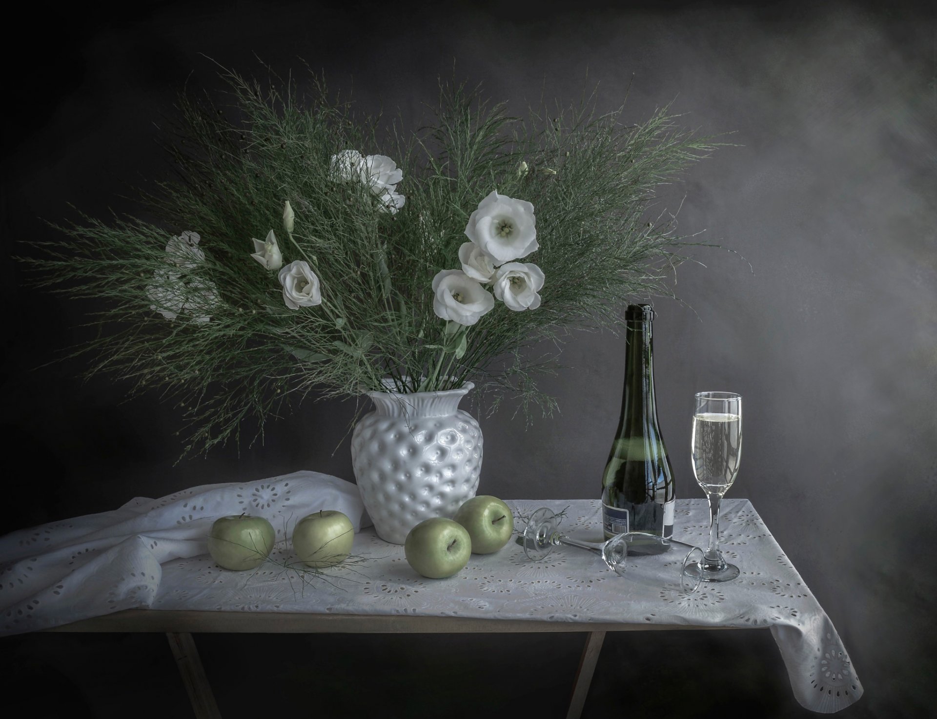 Neujahrs-stillleben mit blumen, äpfeln und champagnerNeujahrs-Stillleben mit Blumen, Äpfeln und Champagner