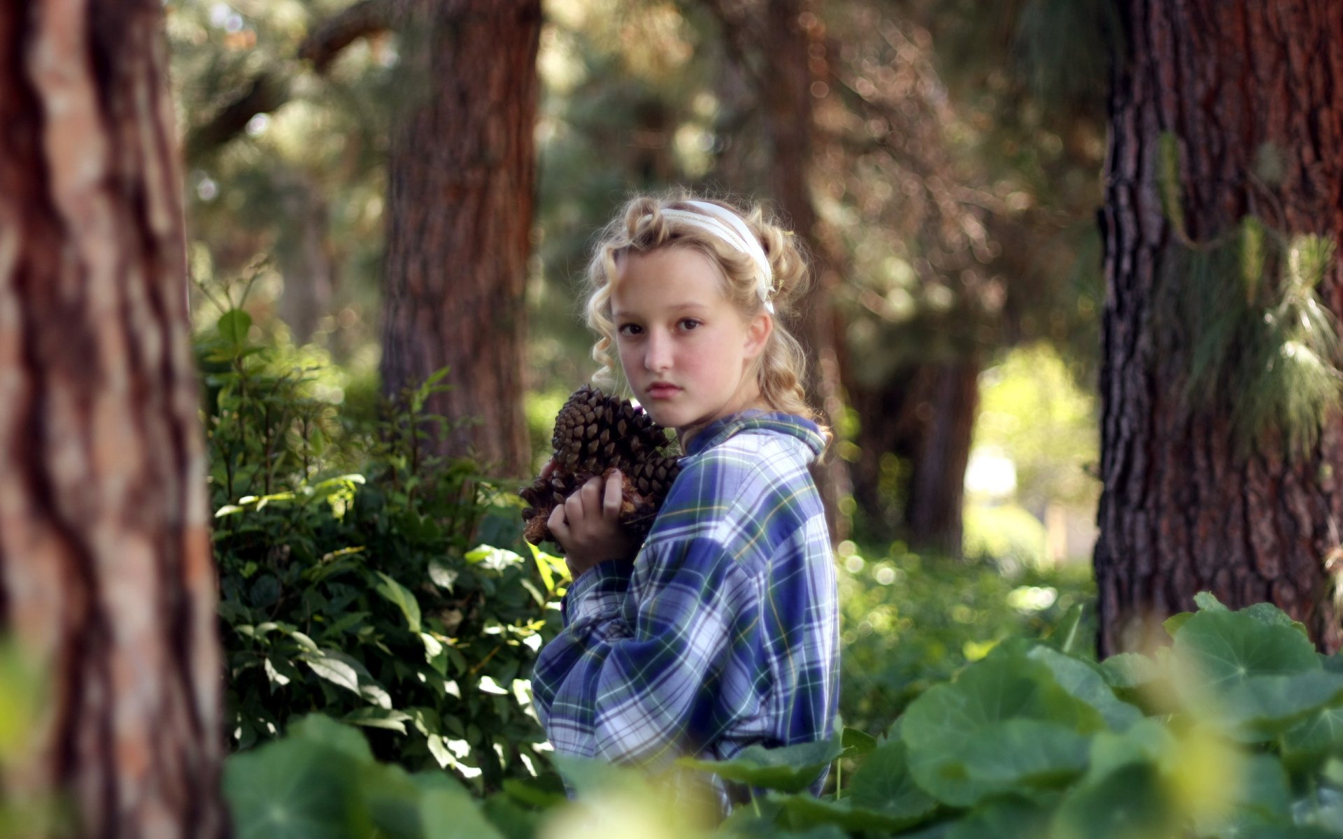 Mädchen im karierten Hemd in Bäumen, Unschärfe