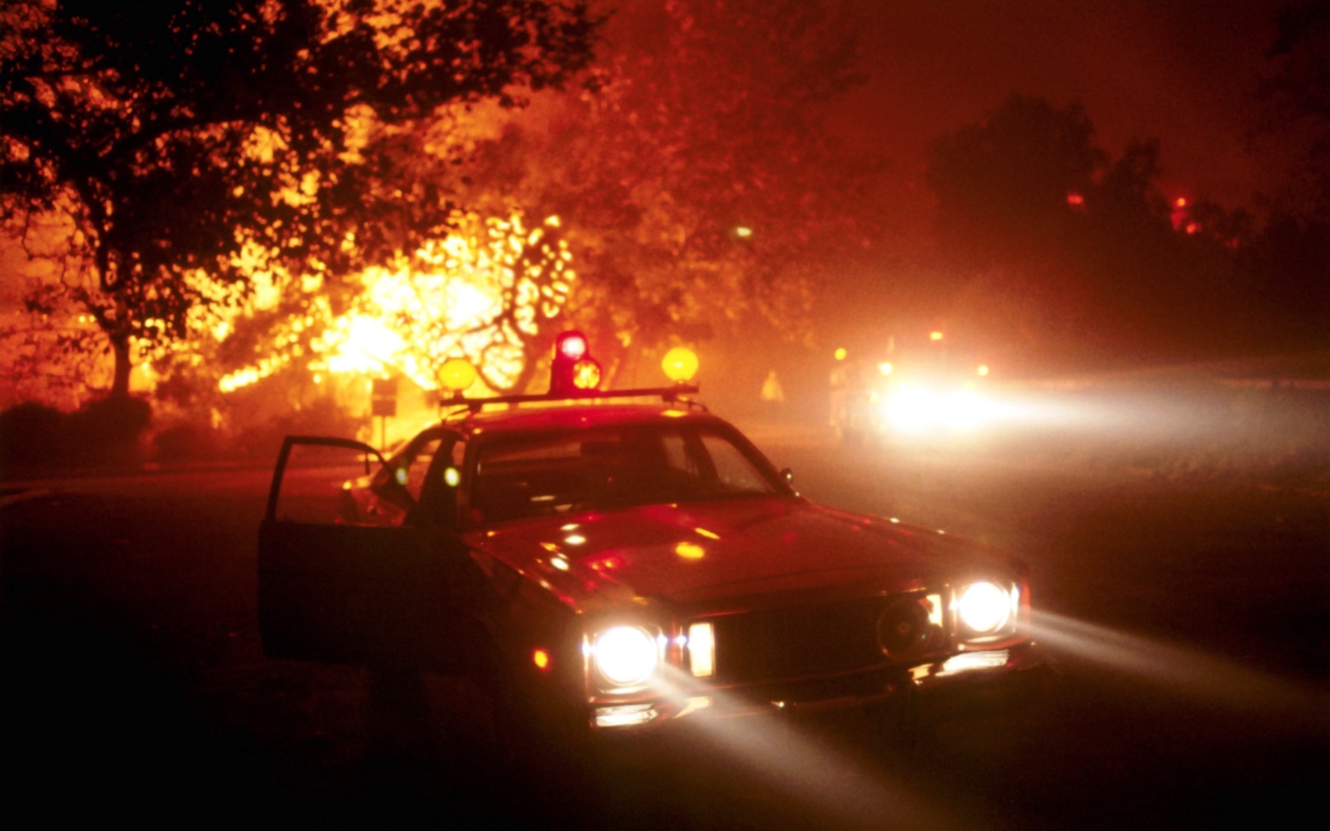 Streifenwagen steht vor dem Hintergrund der Flammen