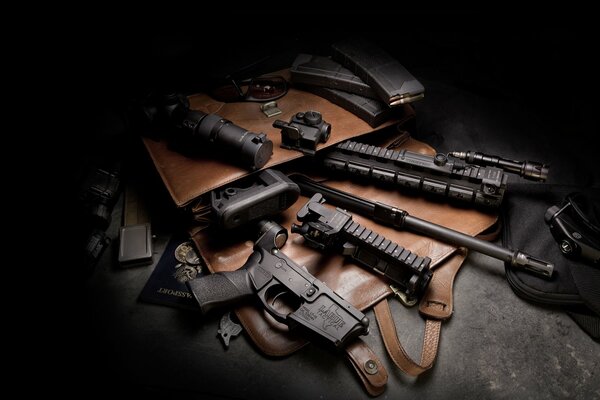 Waffen und Pistolen liegen auf einer Tasche vor einem dunklen Hintergrund