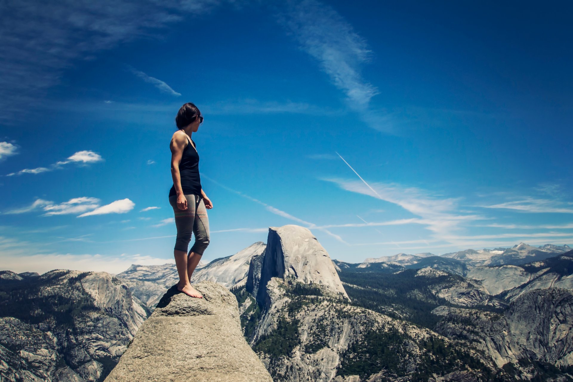 Mädchen steht über einer klippe in einem malerischen talMädchen steht über einer Klippe in einem malerischen Tal