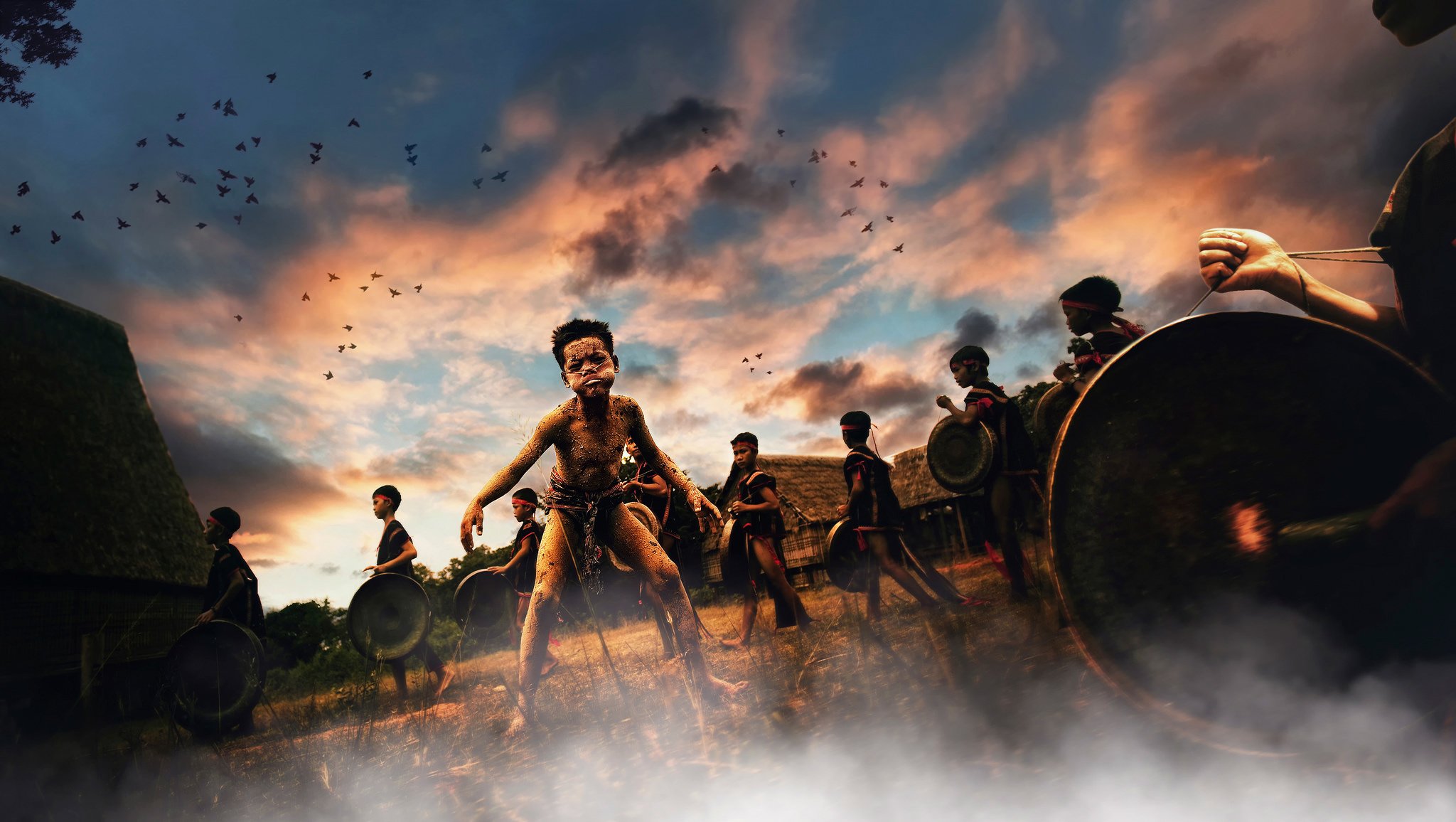 Tanz der schönen Mädchen bei Sonnenuntergang