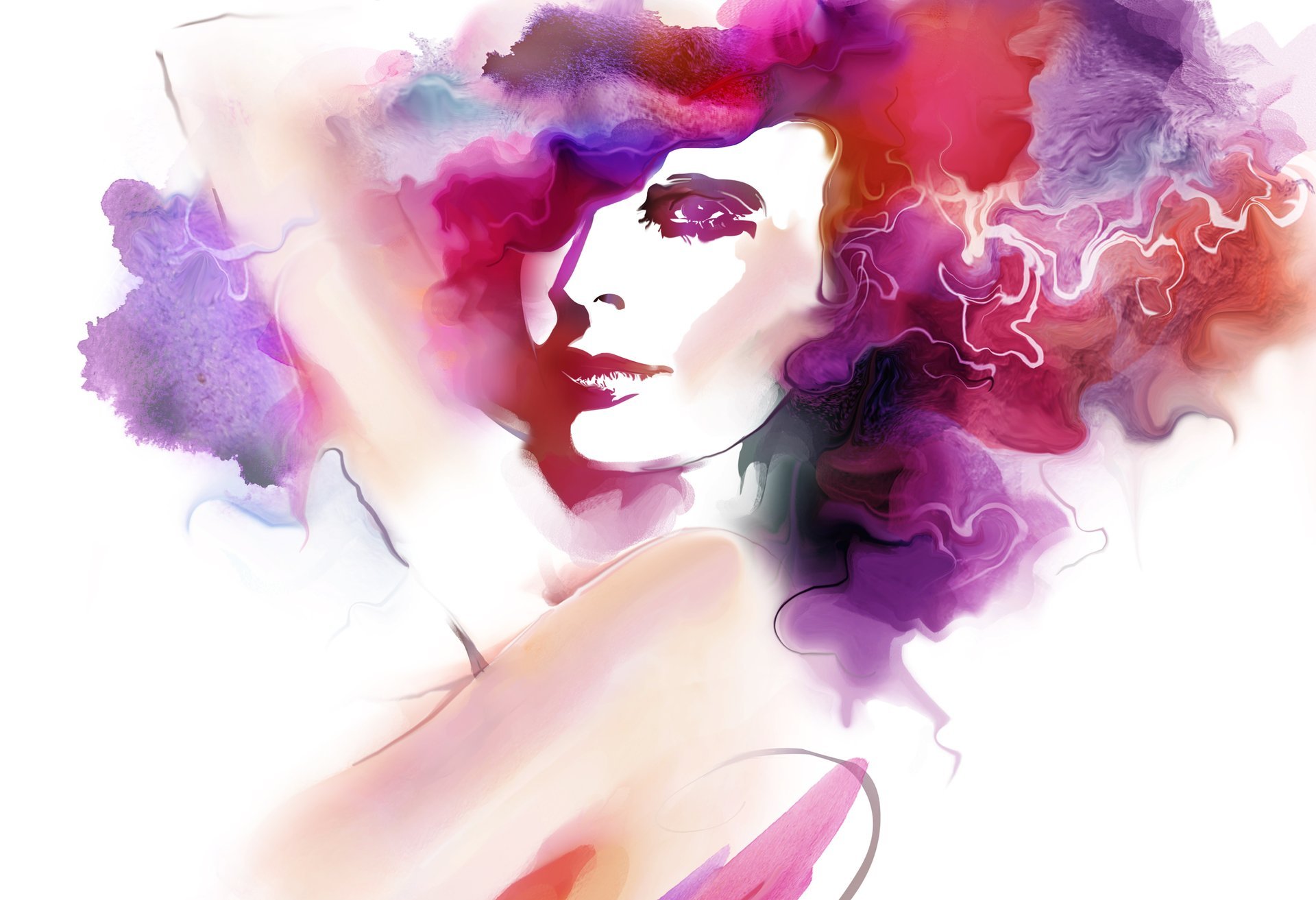 Zeichnung eines Mädchens mit Haaren in Form von Aquarell-Scheidungen