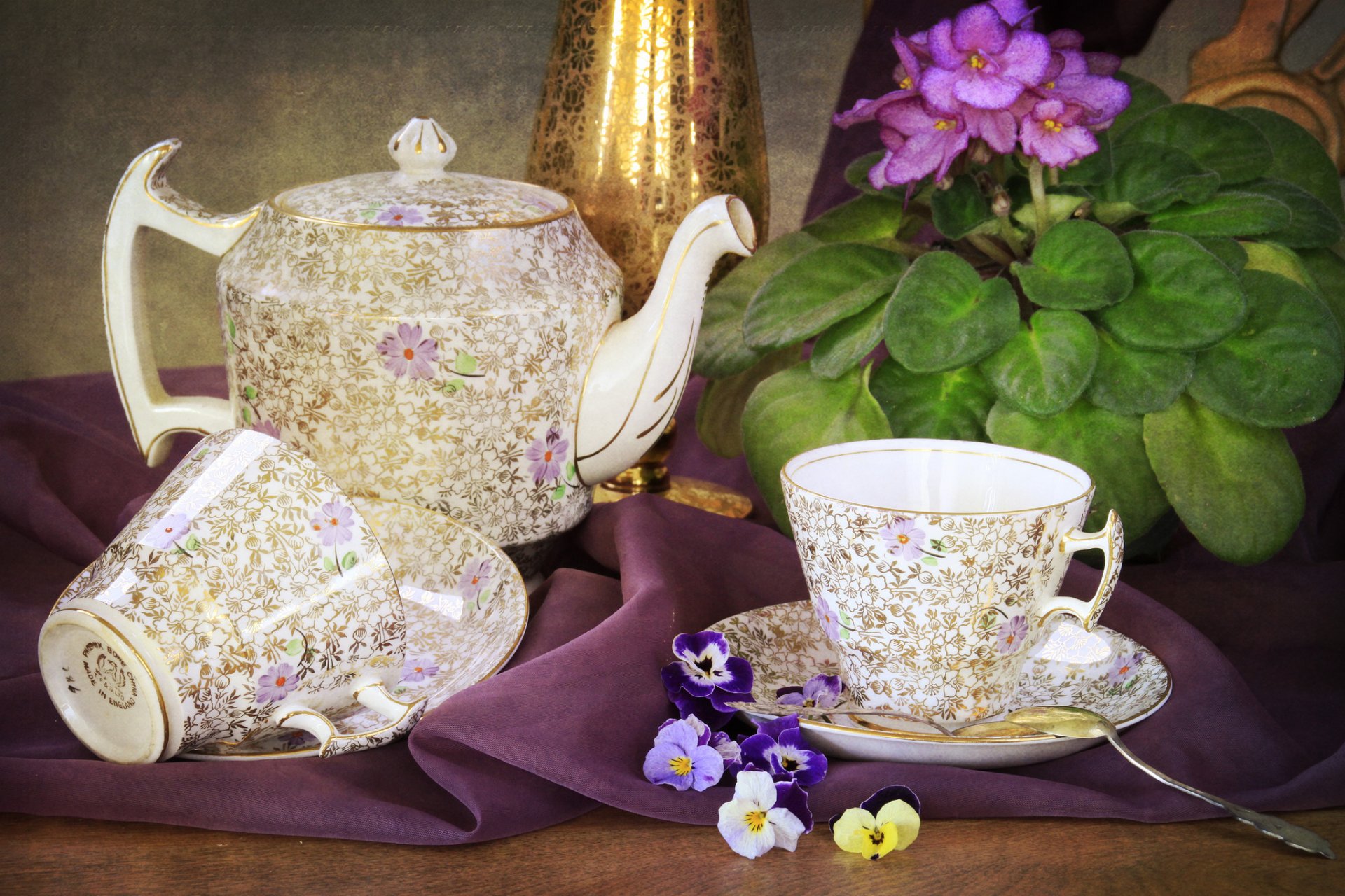 Tee-set mit rosen und halskette auf weißem hintergrundTee-Set mit Rosen und Halskette auf weißem Hintergrund