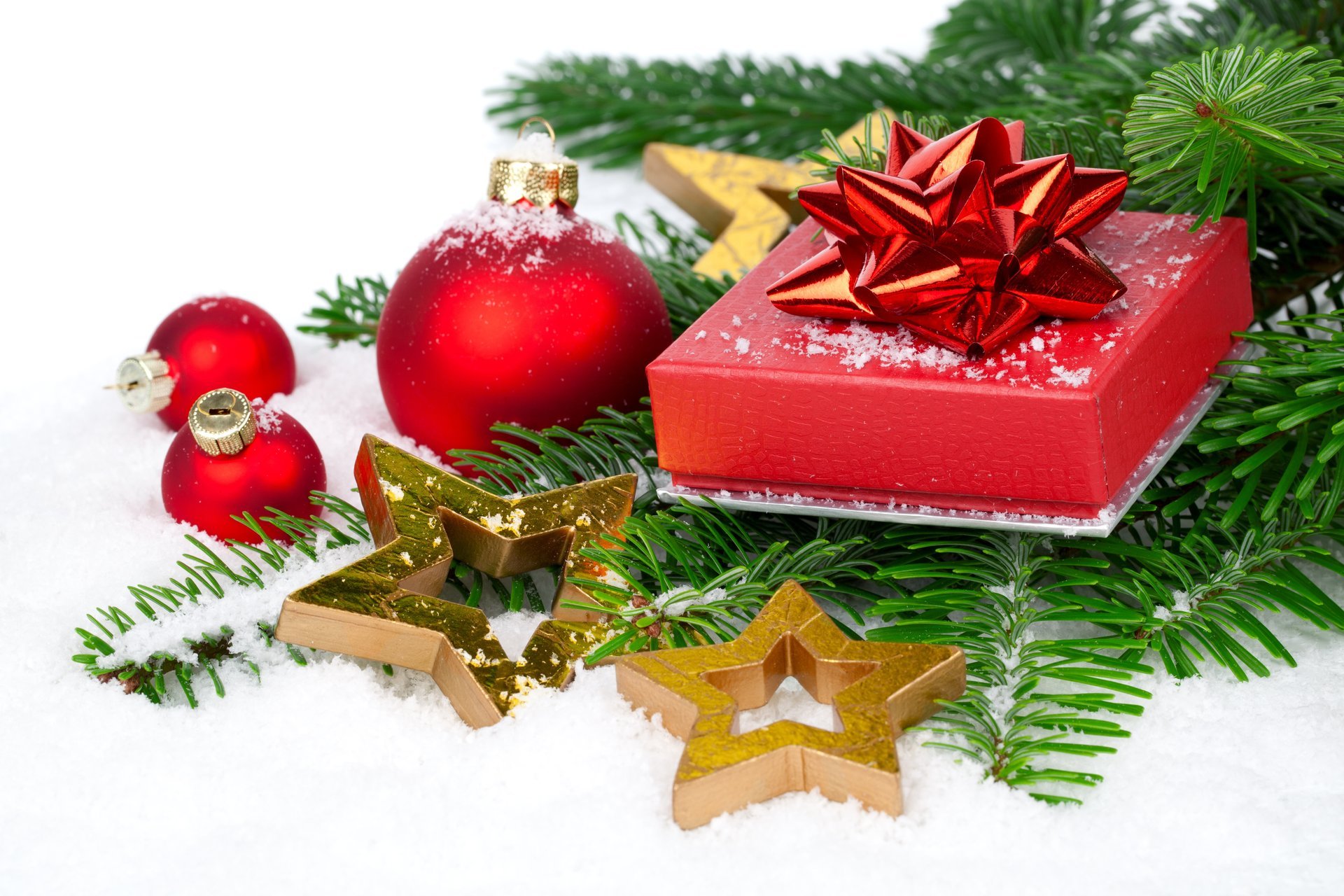 Geschenkbox in goldener Verpackung mit goldenem Bogen auf dem Hintergrund von bunten Lichtflecken