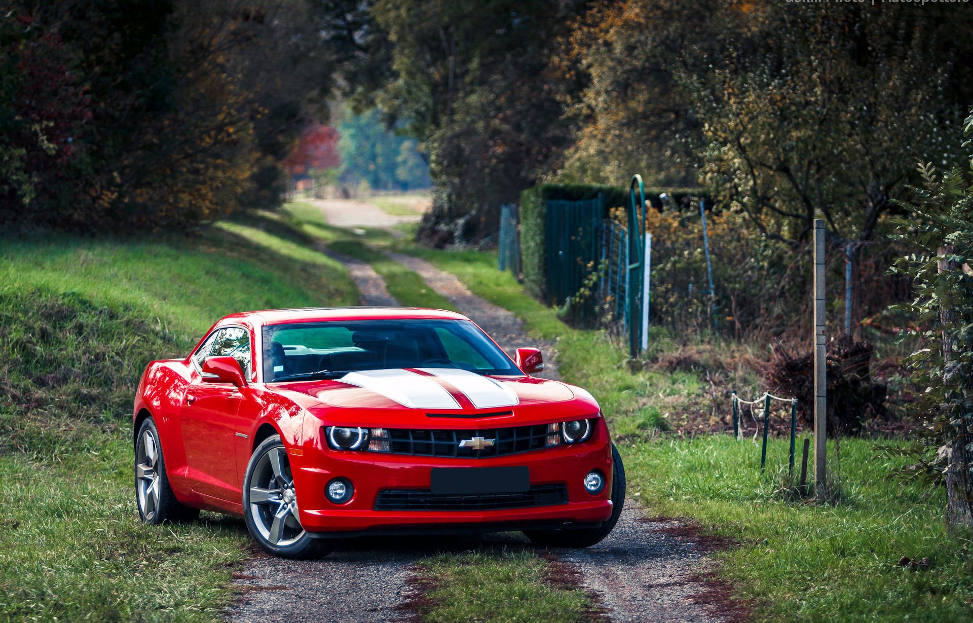 Chevrolet camaro auf einer landstraße in ländlicher umgebungChevrolet Camaro auf einer Landstraße in ländlicher Umgebung