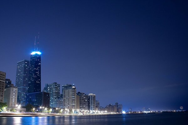 Nachtstadt mit Wolkenkratzern und Lichtern über dem Fluss