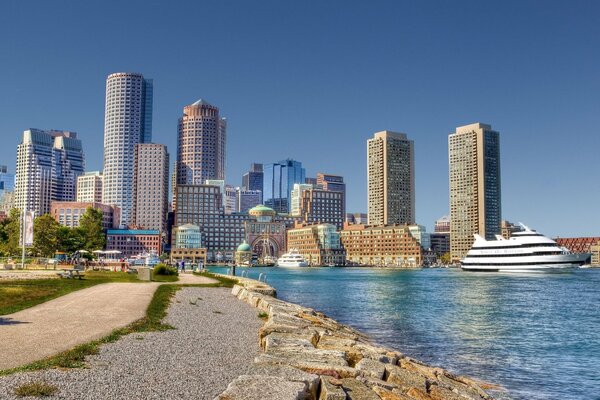 Die Uferpromenade der Metropole vor dem Hintergrund des blauen Himmels