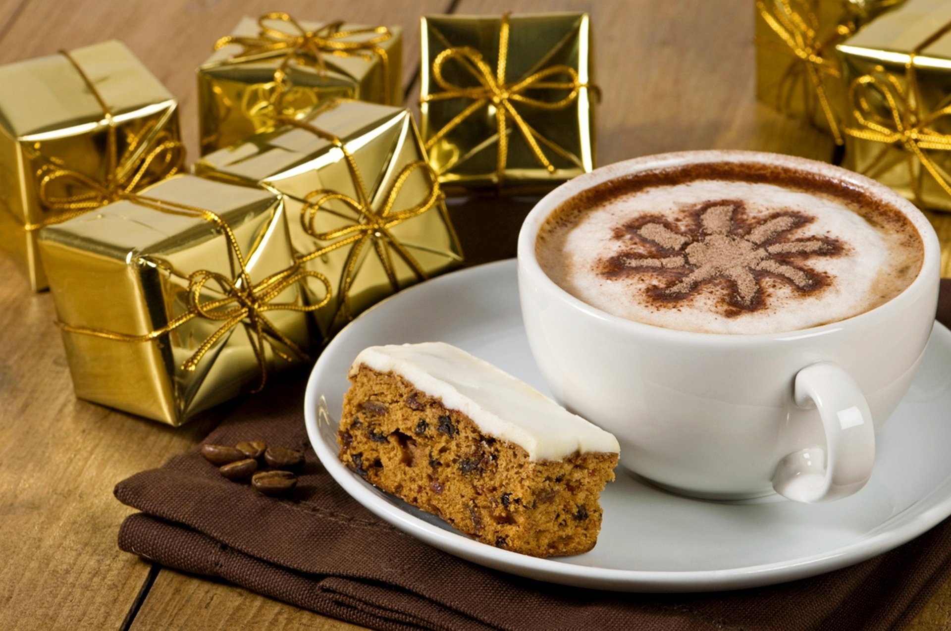 Weihnachtskaffee mit Cupcake und Geschenken