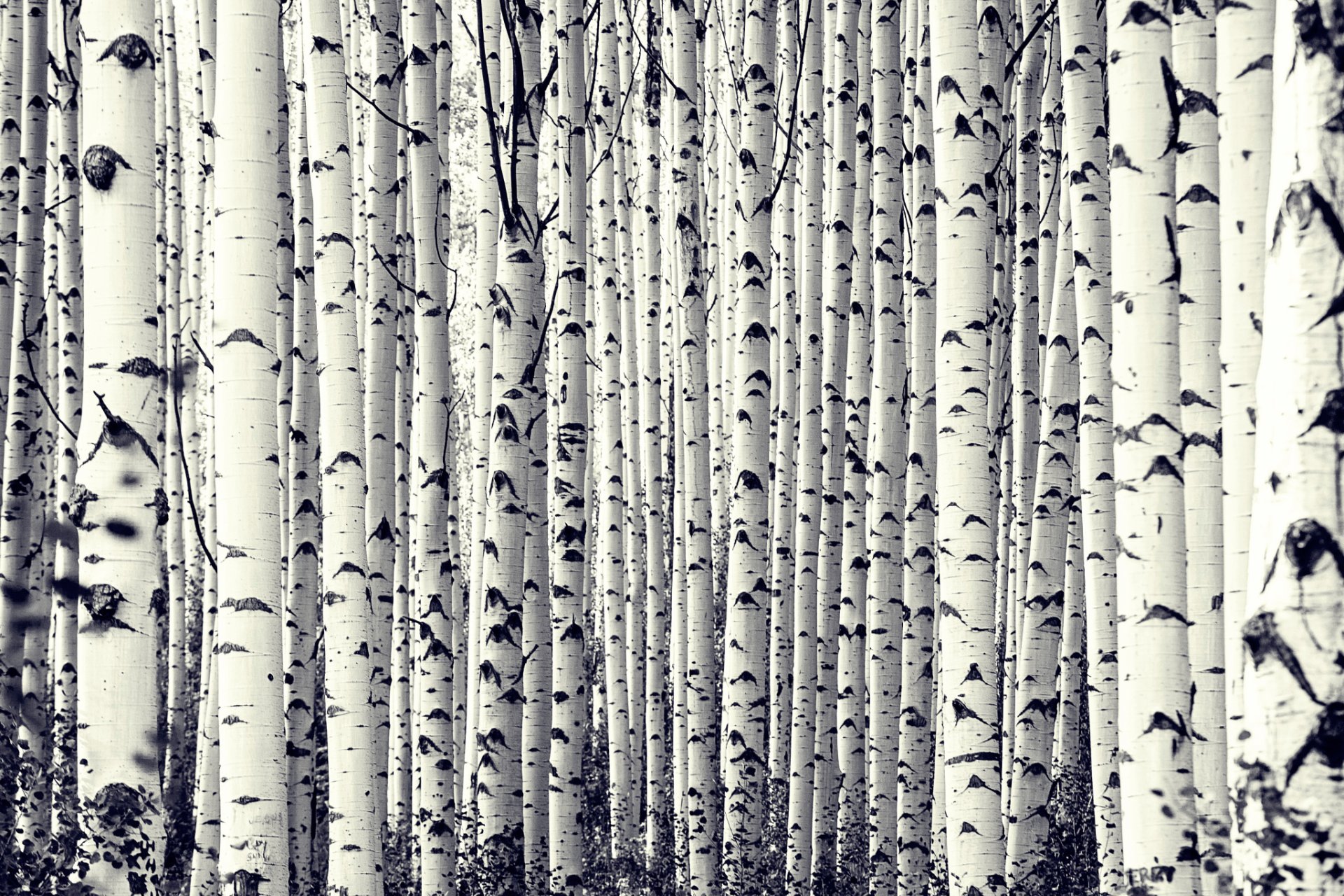 Der herbstliche Birkenwald ist mit orangefarbenen Sonnenstrahlen erleuchtet