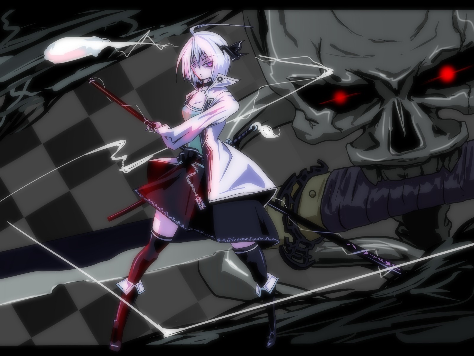 Blaue Augen anime Mädchen in Strümpfen und Handschuhen. Süßer Kuchen