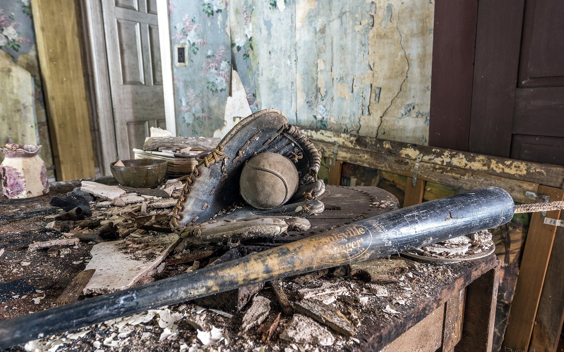 Ein Baseballschläger, ein Handschuh und ein Ball in einem zerstörten Haus