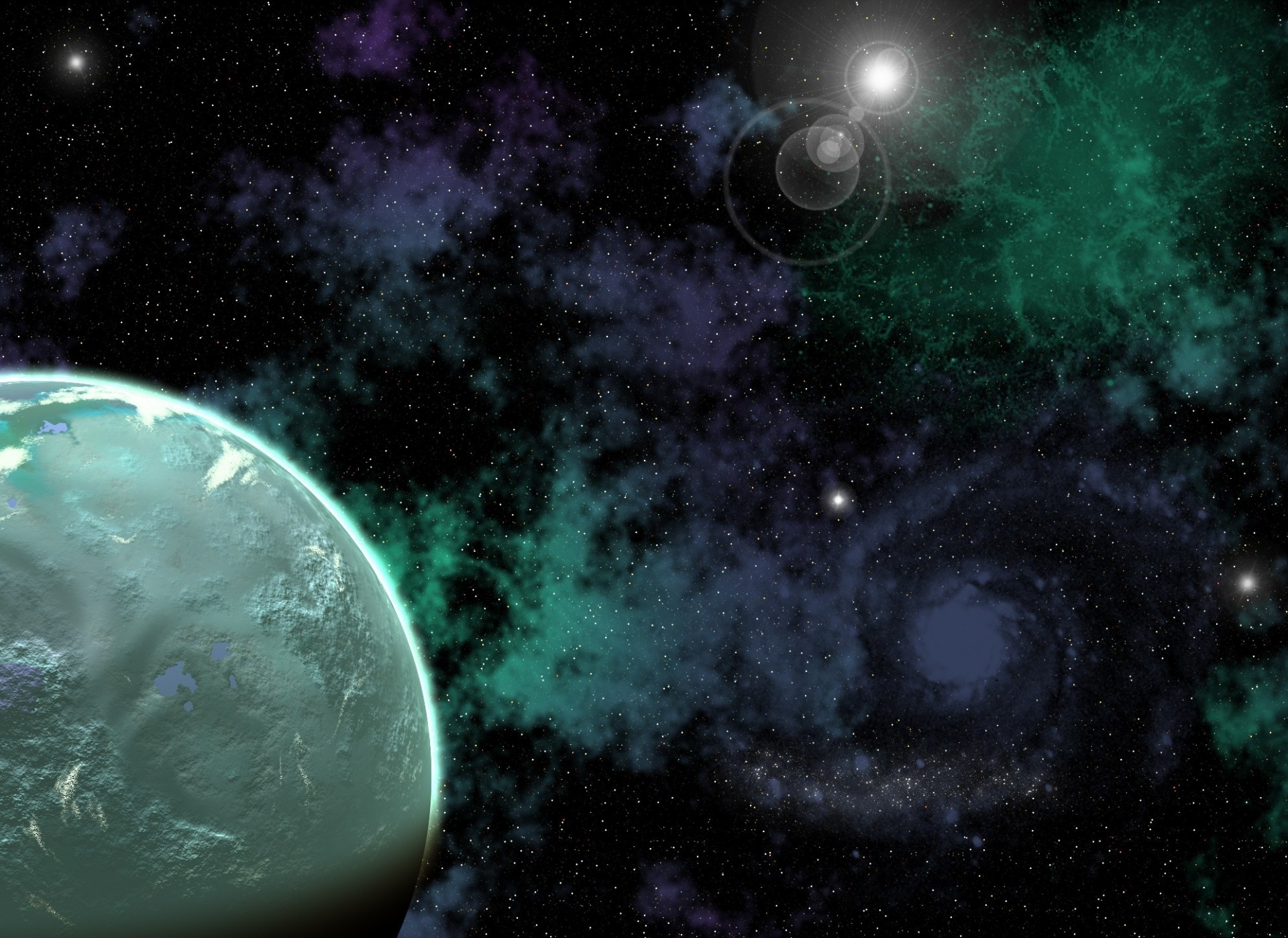 Die Erde in einer Sonnenfinsternis und ein leuchtender Funke, der dem entgegen fliegt