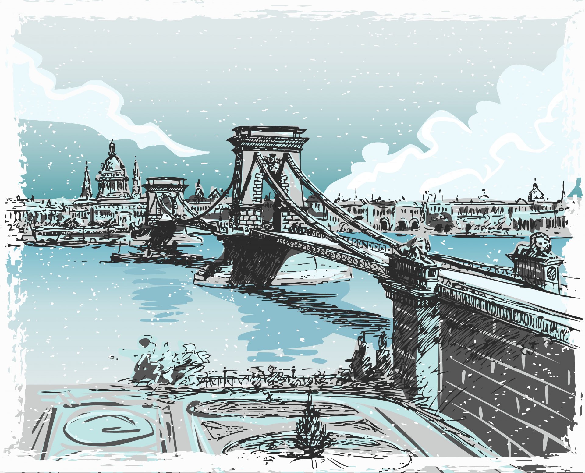 Brücke über den Fluss mit der Symbolik der Olympischen Spiele